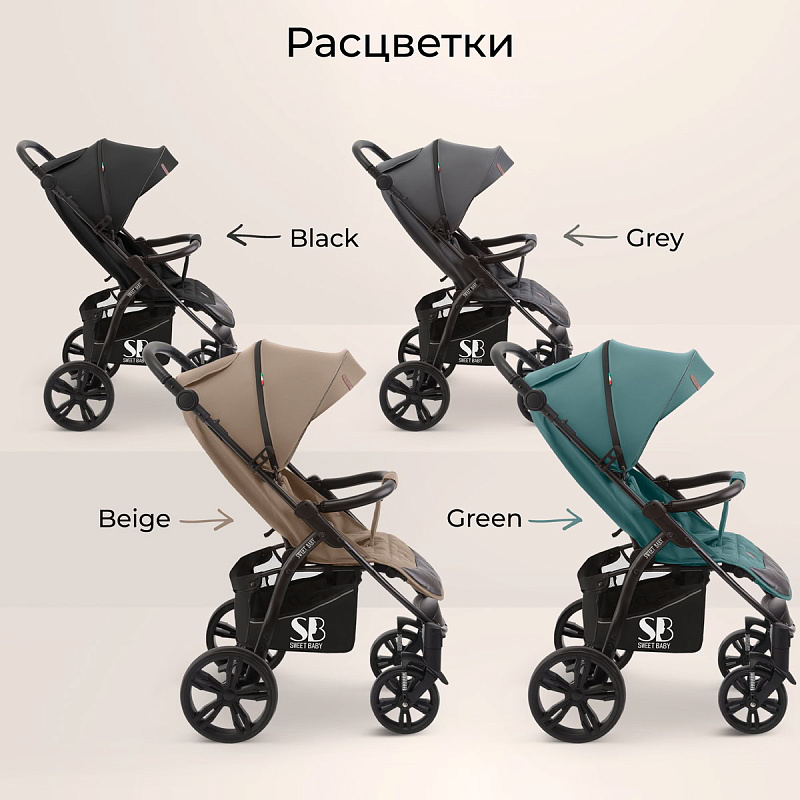 Sweet baby Carisma – новая всесезонная прогулочная коляска итальянского бренда, созданная для безусловного комфорта в путешествиях и прогулках любого формата детей в возрасте от 6 месяцев и до 3х лет . Отличительной особенностью коляски является горизонтальное положение для беззаботного сна и комфортная механическая регулировка спинки (3 положения). Верхняя часть коляски выполнена из инновационного материала с повышенной износостойкостью и устойчивого к выцветанию. Компактная система складывания коляски вместе с сиденьем, при которой рама занимает устойчивую вертикальную позицию, надежно фиксируется держателем, сохраняется гигиеничность ручки и текстильной обивки. Большие задние колеса легко преодолевают неровности грунта и препятствия загородных дорог, передние позволяют маневрировать в сложных городских условиях и являются полноповоротными, что значительно облегчает управление коляской. Функция блокировки передних колес удобна при передвижении по снегу и грязи. В комплекте есть дождевик и подстаканник