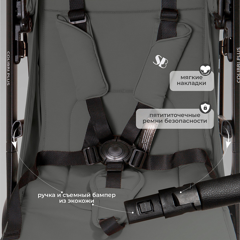 - Пятиточечные ремни безопасности с мягкими накладками гарантируют надежную фиксацию во время прогулок.