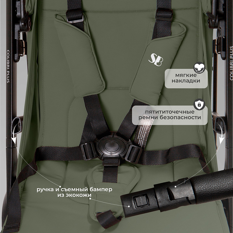 - Пятиточечные ремни безопасности с мягкими накладками гарантируют надежную фиксацию во время прогулок.
