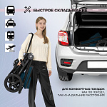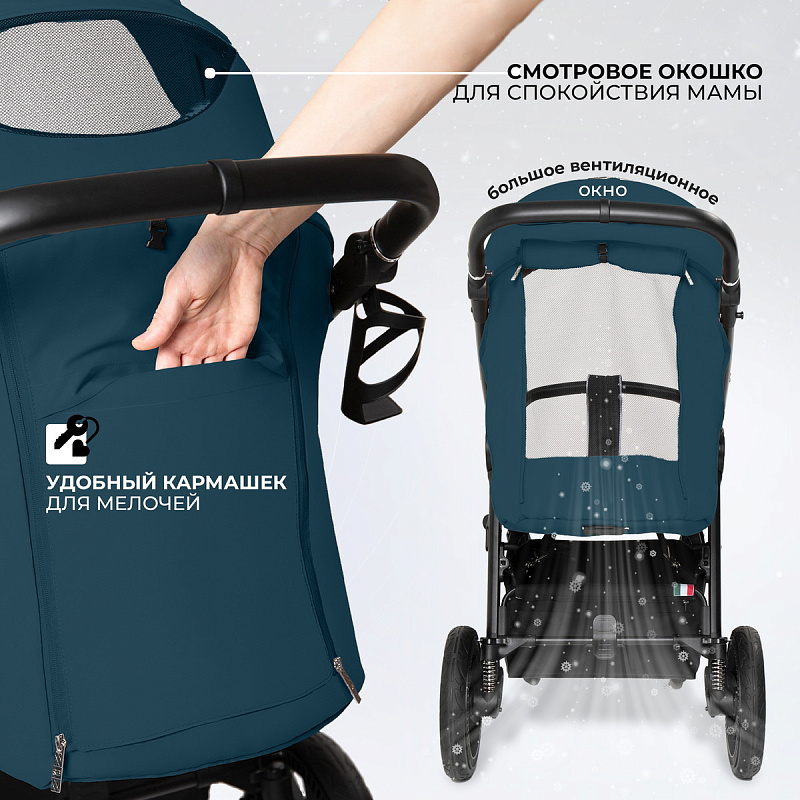 Легкое сложение одной рукой и карман для мелочей делают использование коляски удобным, а большое проветриваемое окошко с сеткой и смотровое окошко создают для малыша оптимальный микроклимат, а родителям позволяют наблюдать за своим чадом во время поездки.