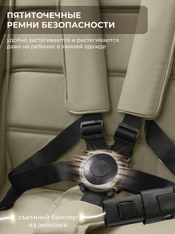 Безопасность вашего малыша обеспечивают магнитные ремни (что очень удобно, так как малыш фиксируется одним нажатием), мягкие накладки, которые добавляют комфорт во время движения, а межпаховая перемычка усиливает безопасность. Отстегивающийся бампер позволяет легко усаживать малыша.