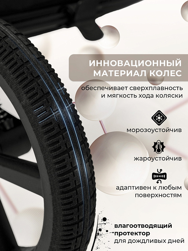 Особое внимание уделено инновационным колесам, которые с легкостью преодолевают любые препятствия и гарантируют плавный ход и маневренность. Материал колес из высокомолекулярного полимера уменьшает вес всей коляски, ведь колеса невесомы и сравнимы с легкими беговыми кроссовками последнего поколения. Диаметр колес увеличен, для возможности использования коляски во всех 4-х сезонах. Но помимо колес, мы предусмотрели пружинную амортизацию передних и задних колес. Передние колеса поворотные с фиксацией.