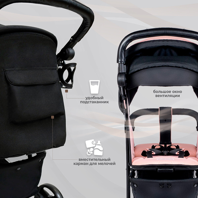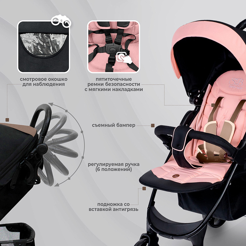 - 4 положения большого капюшона с козырьком закрывают малыша от солнца, ветра и снега