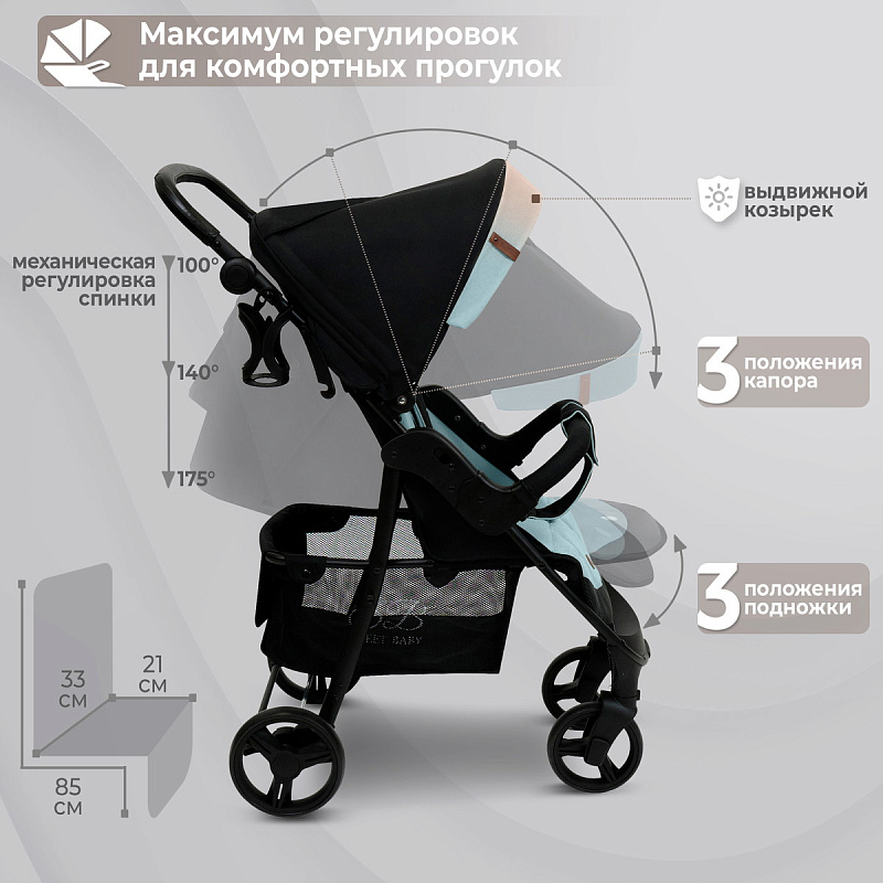 Удобная и функциональная детская прогулочная коляска Sweet baby Rapido предназначена для детей с шести месяцев и до трех лет. Мягкая подвеска на все колеса, позволяет проезжать по любым поверхностям, 3 положения спинки для активных прогулок и спокойного сна регулируются удобным рычагом.