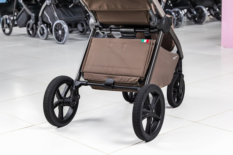 - Детская коляска SBL Elegante D обладает маневренностью, плавностью хода и отличной проходимостью. Все благодаря большим задним колёсам (26 см), передним поворотным колесам с фиксацией (19 см) из инновационного материала- высокомолекулярного полимера, а также пружинной амортизации на все 4 колесах;