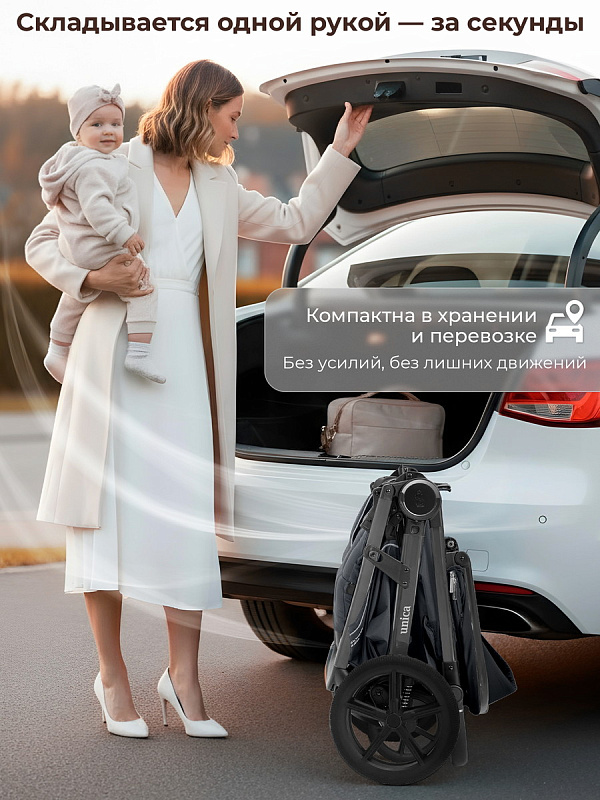 Система складывания одной рукой делает использование коляски еще более удобным. В собранном виде она устойчиво стоит без опоры, не пачкая обивку и ручку.