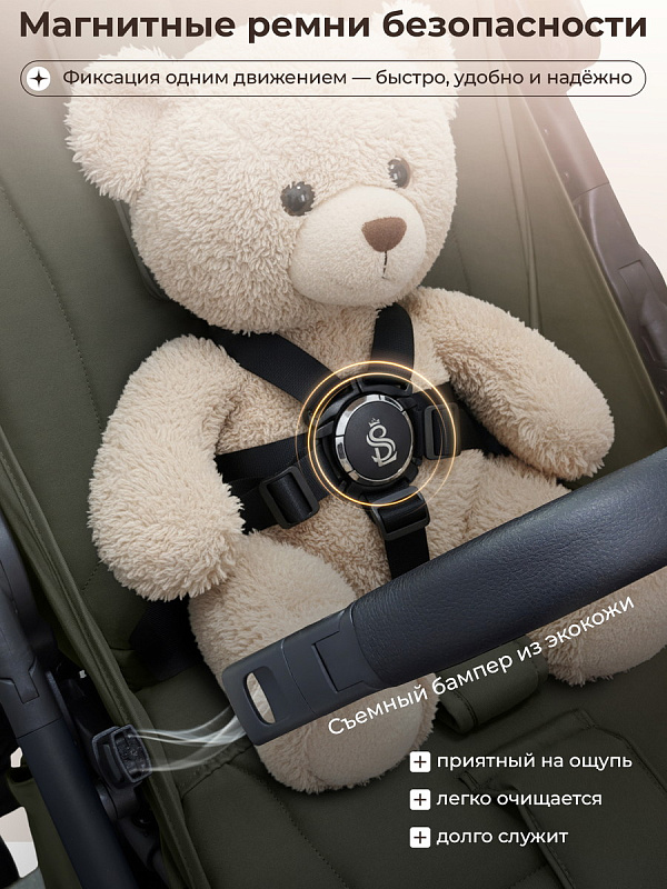 Широкое и комфортное сиденье обеспечит вашему ребенку удобство даже в комбинезоне. Магнитные ремни безопасности добавляют удобства родителям. Большое спальное место позволит малышу чувствовать себя уютно в поездке.