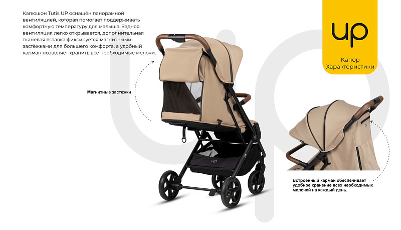 Капюшон Tutis UP оснащён панорамной вентиляцией, которая помогает поддерживать комфортную температуру для малыша. Задняя вентиляция легко открывается, дополнительная тканевая вставка фиксируется магнитными застёжками для большего комфорта, а удобный карман позволяет хранить все необходимые мелочи.