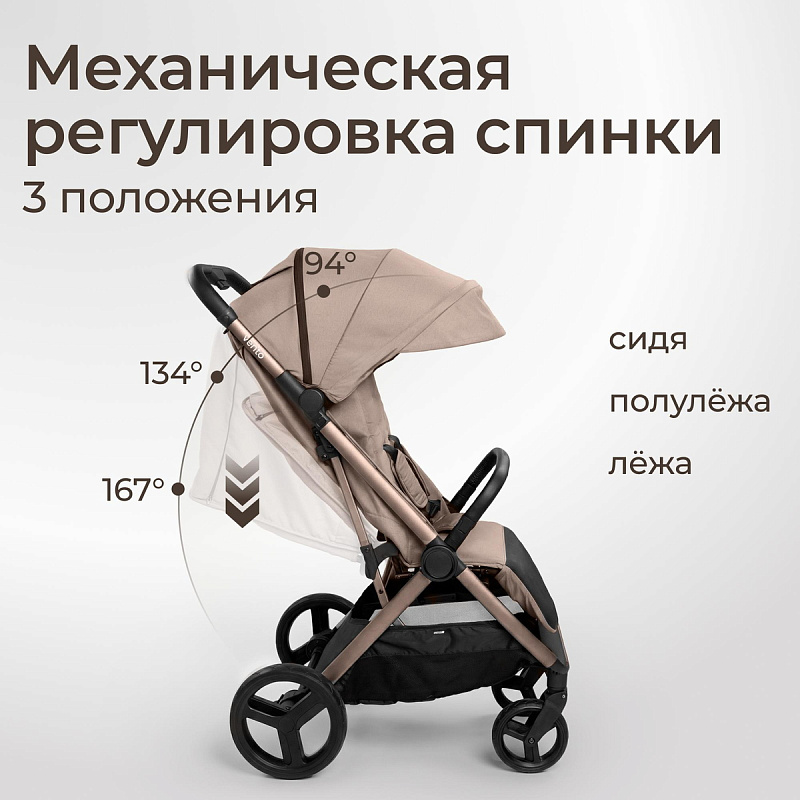 Спинка и положения: прогулочный блок имеет три комфортных положения: сидя (94°), полулёжа (134°) и лёжа (167°). Регулировка осуществляется простым рычагом, что позволяет быстро адаптировать спинку под нужды ребёнка. Капюшон из ткани с защитой от ультрафиолета SPF50+ раскрывается широко и надежно защищает от солнца, ветра и дождя. Смотровое вентиляционное окно на магнитной застёжке позволяет всегда держать малыша в поле зрения и обеспечивать постоянный приток свежего воздуха, создавая комфортный микроклимат внутри коляски.
