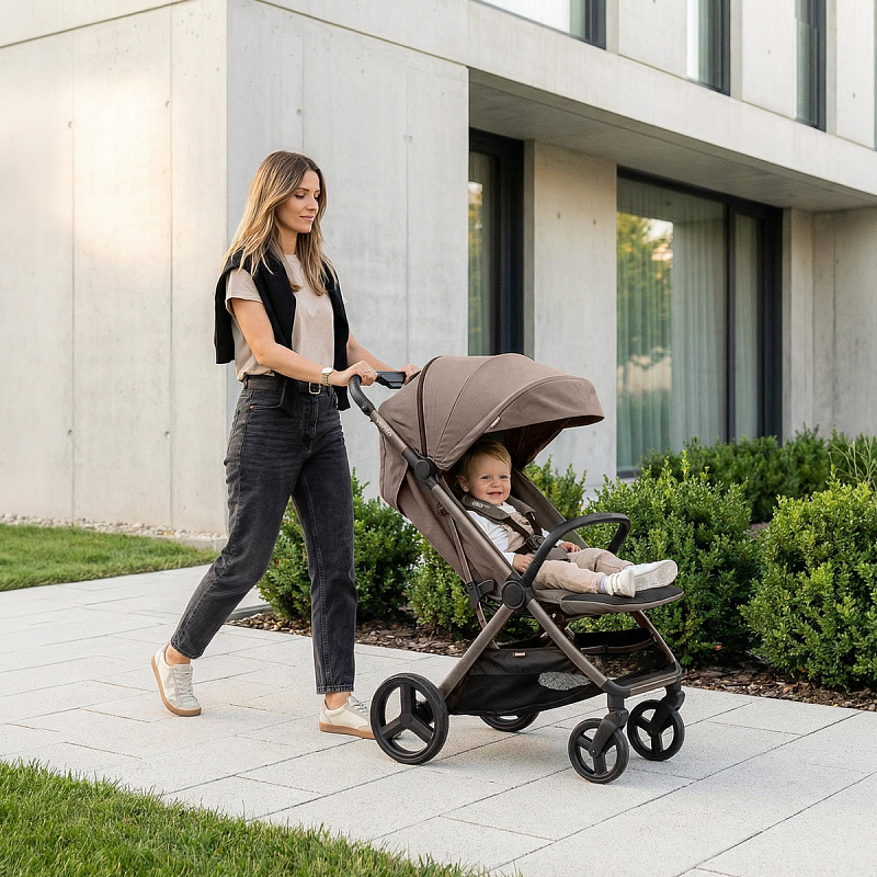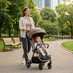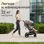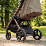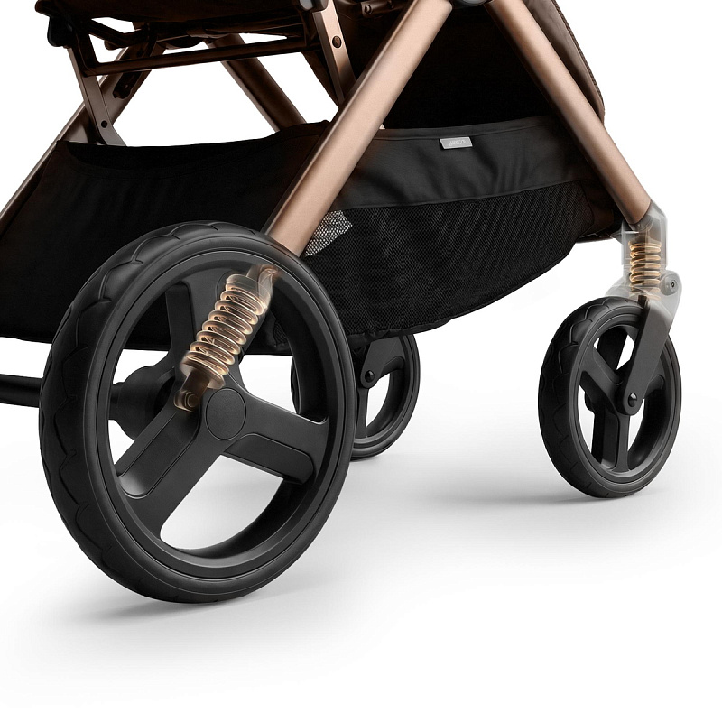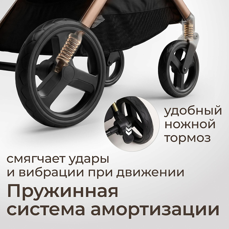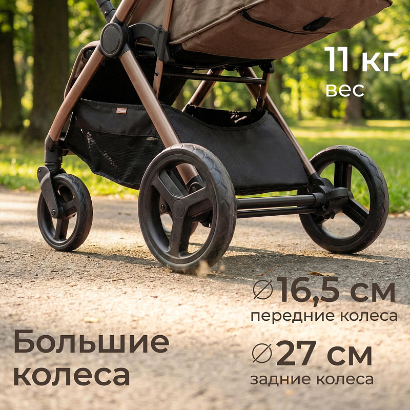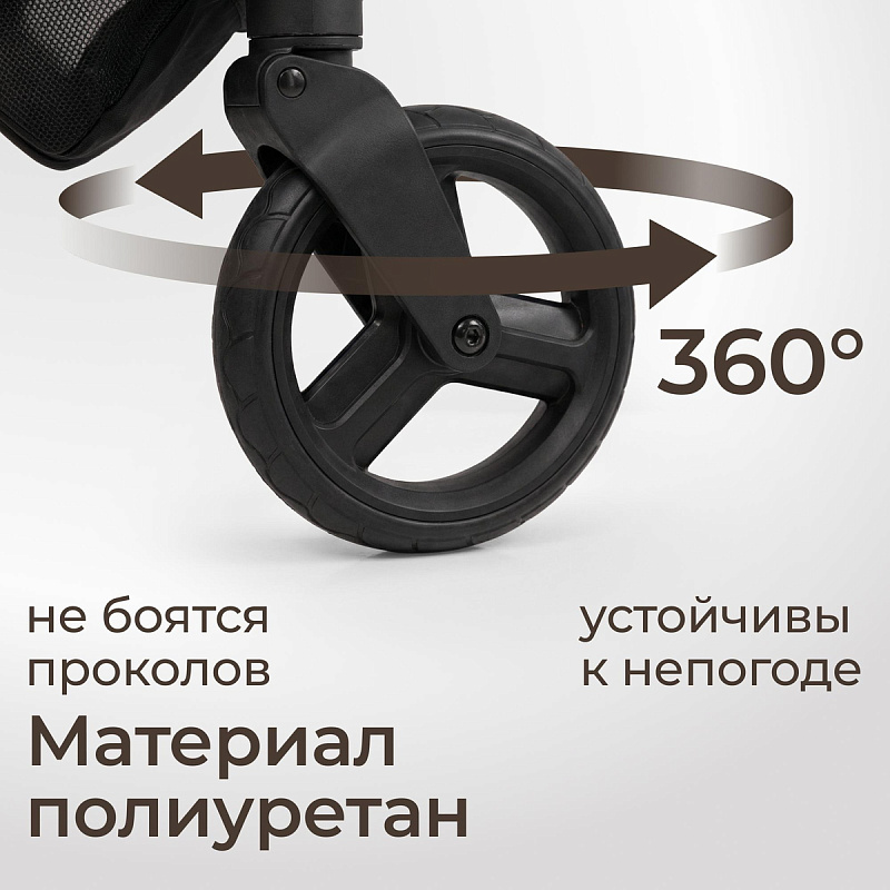 Легкая прогулочная коляска оснащена большими всесезонными задними колесами диаметром 27 см из полиуретана. Они не боятся проколов, обеспечивают отличную проходимость по снегу, песку, гравию и бездорожью. Передние маневренные поворотные колеса на 360° диаметром 16,5 см делают управление максимально легким даже одной рукой. Все колеса быстросъёмные для удобства хранения и чистки. Мягкая пружинная амортизация на всех колесах эффективно гасит удары и вибрации, обеспечивая плавный и мягкий ход даже по неровным дорогам. Это гарантирует спокойный сон ребёнка во время прогулки.