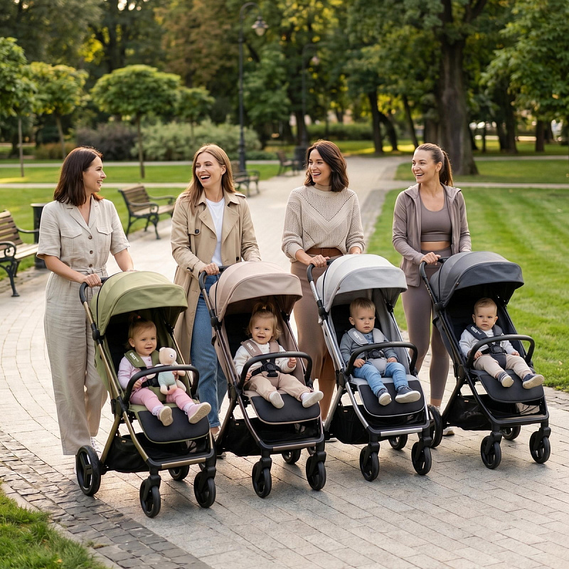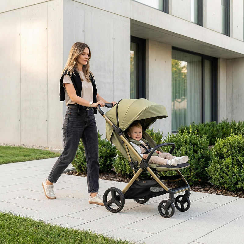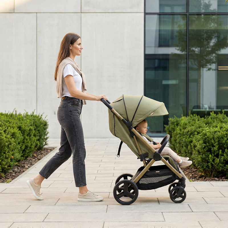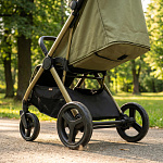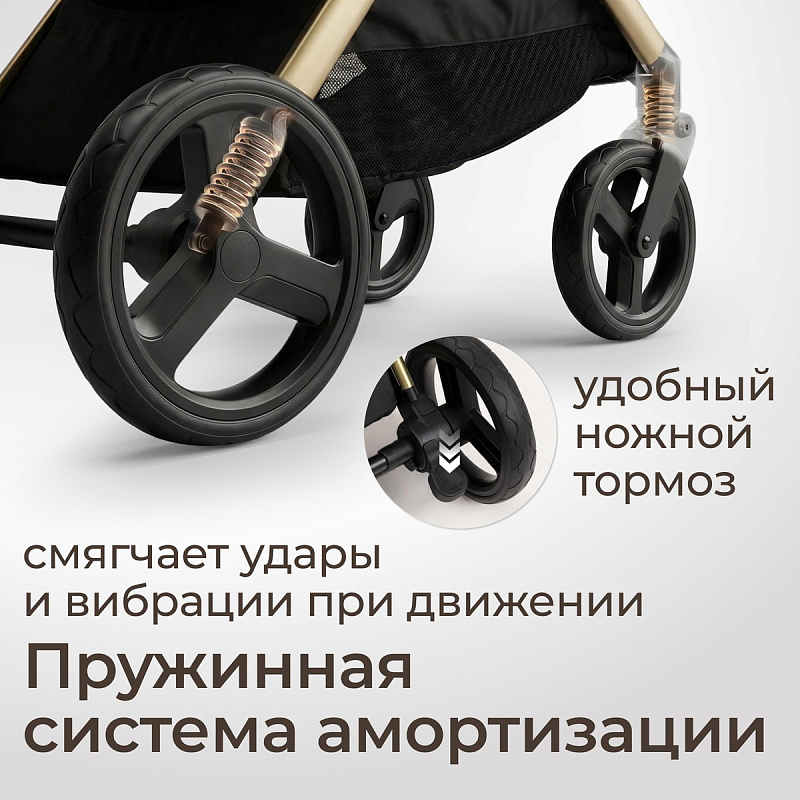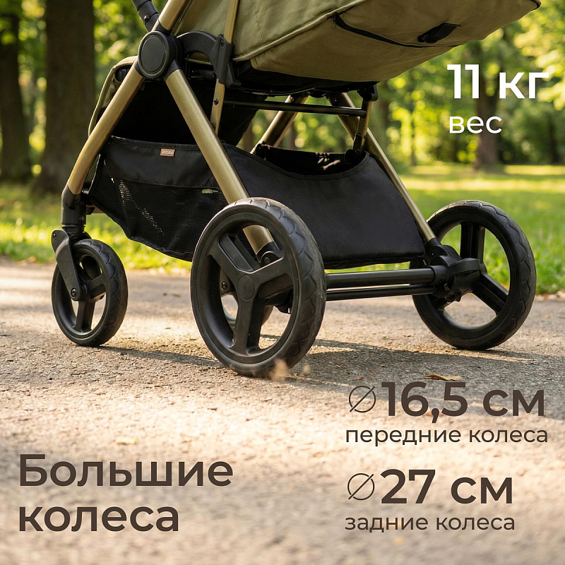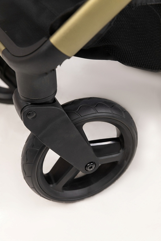 Легкая прогулочная коляска оснащена большими всесезонными задними колесами диаметром 27 см из полиуретана. Они не боятся проколов, обеспечивают отличную проходимость по снегу, песку, гравию и бездорожью. Передние маневренные поворотные колеса на 360° диаметром 16,5 см делают управление максимально легким даже одной рукой. Все колеса быстросъёмные для удобства хранения и чистки. Мягкая пружинная амортизация на всех колесах эффективно гасит удары и вибрации, обеспечивая плавный и мягкий ход даже по неровным дорогам. Это гарантирует спокойный сон ребёнка во время прогулки.