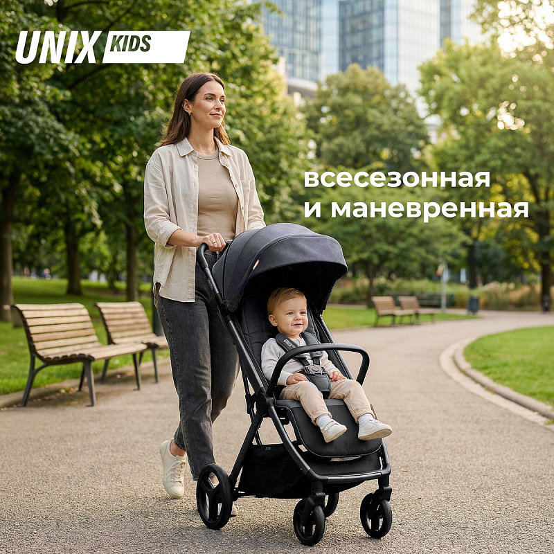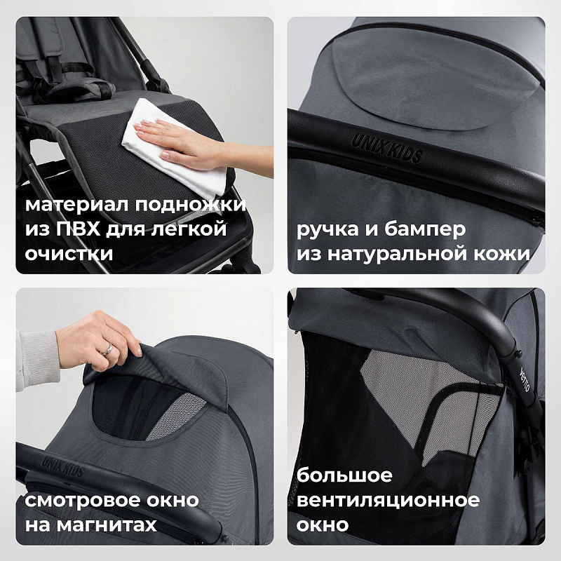 Всесезонная складная коляска для детей UNIX Kids Vento выделяется на фоне других моделей сочетанием премиальных материалов (натуральная кожа, анодированный алюминий), продуманной эргономикой (складывание одной рукой, регулировка одной кнопкой) и богатейшей комплектацией.