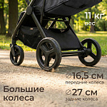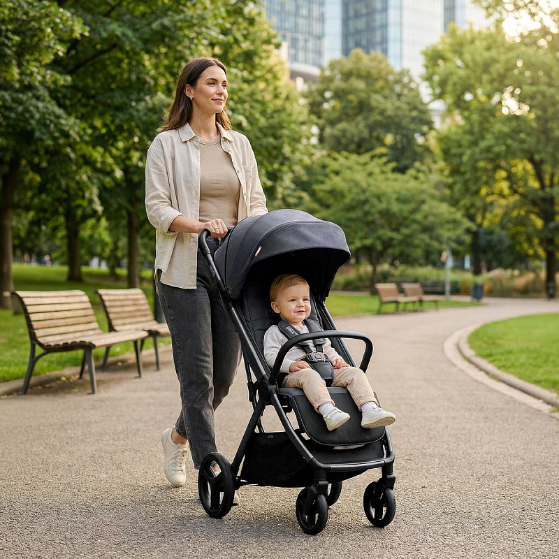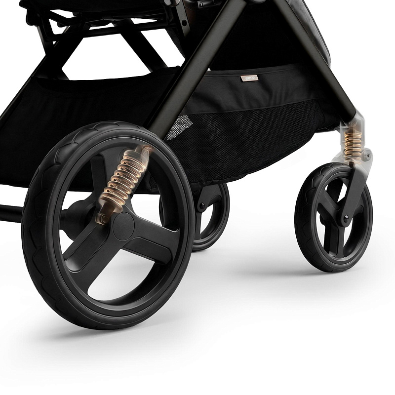 Легкая прогулочная коляска оснащена большими всесезонными задними колесами диаметром 27 см из полиуретана. Они не боятся проколов, обеспечивают отличную проходимость по снегу, песку, гравию и бездорожью. Передние маневренные поворотные колеса на 360° диаметром 16,5 см делают управление максимально легким даже одной рукой. Все колеса быстросъёмные для удобства хранения и чистки. Мягкая пружинная амортизация на всех колесах эффективно гасит удары и вибрации, обеспечивая плавный и мягкий ход даже по неровным дорогам. Это гарантирует спокойный сон ребёнка во время прогулки.