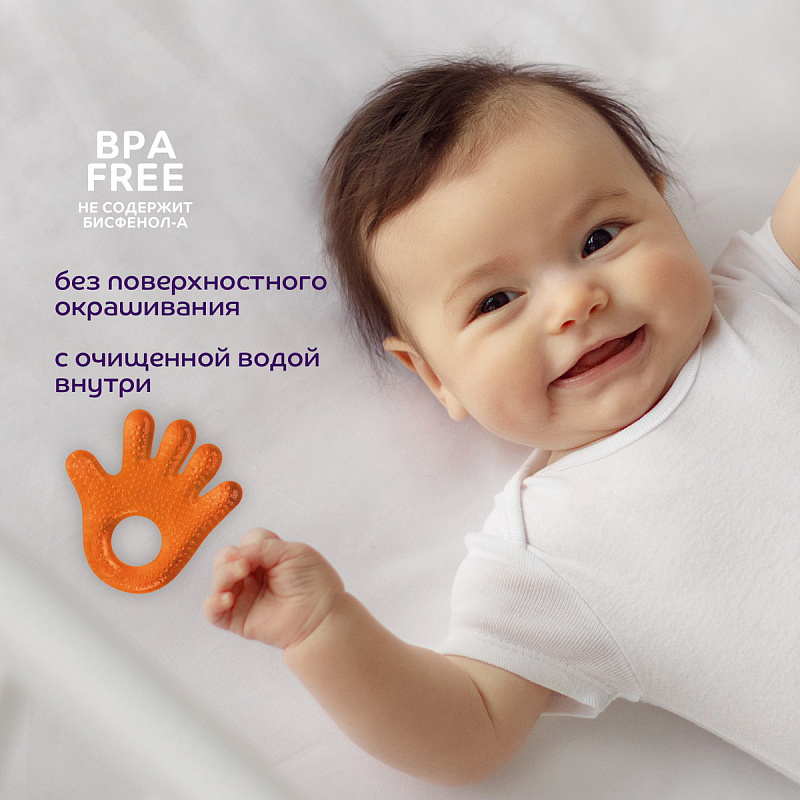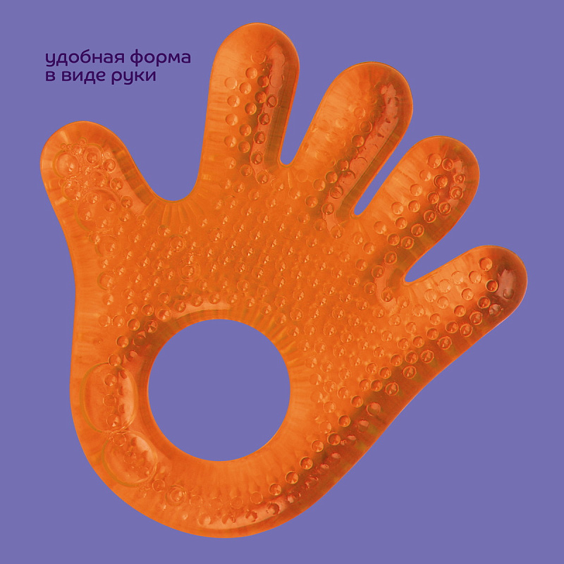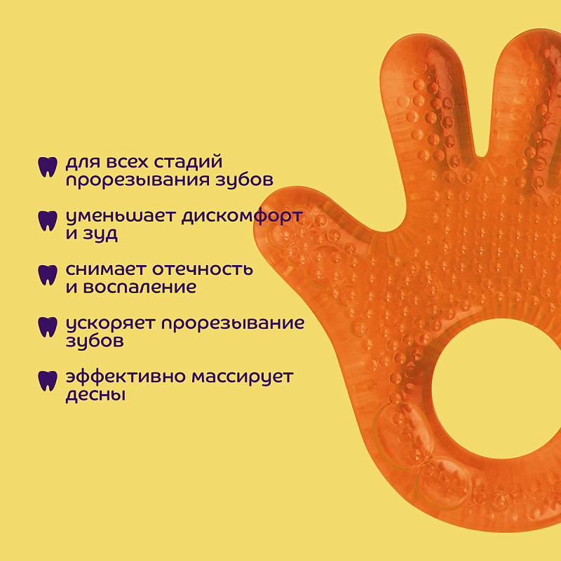 Прорезыватель поможет уменьшить неприятные ощущения во время прорезывания зубов. Благодаря текстурированной поверхности создается массажный эффект, успокаивающий раздражение. Содержит очищенную воду внутри. Для достижения дополнительного анестезирующего эффекта можно положить прорезыватель в холодильник на 10 минут. Подходит для всех стадий появления зубов.Изготовлен из безопасного материала и не содержит вредных веществ.