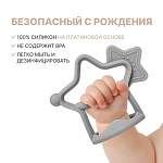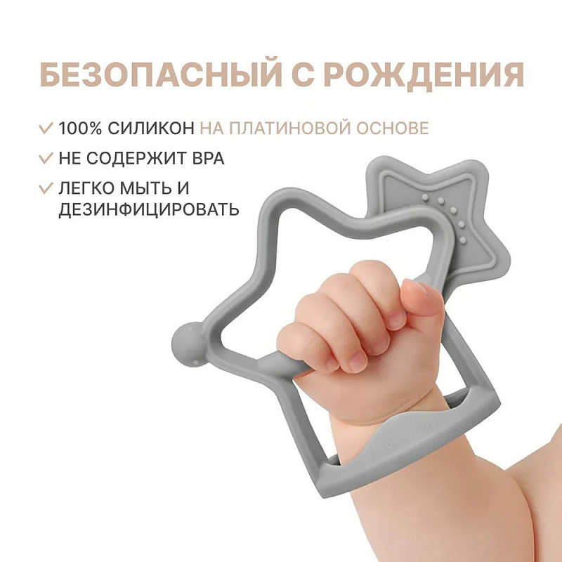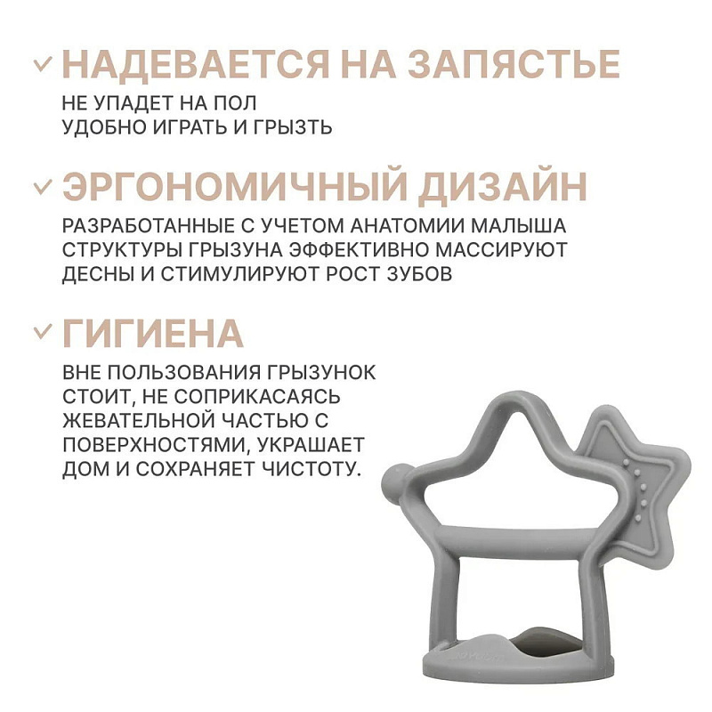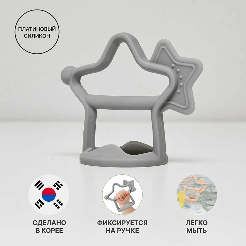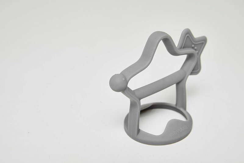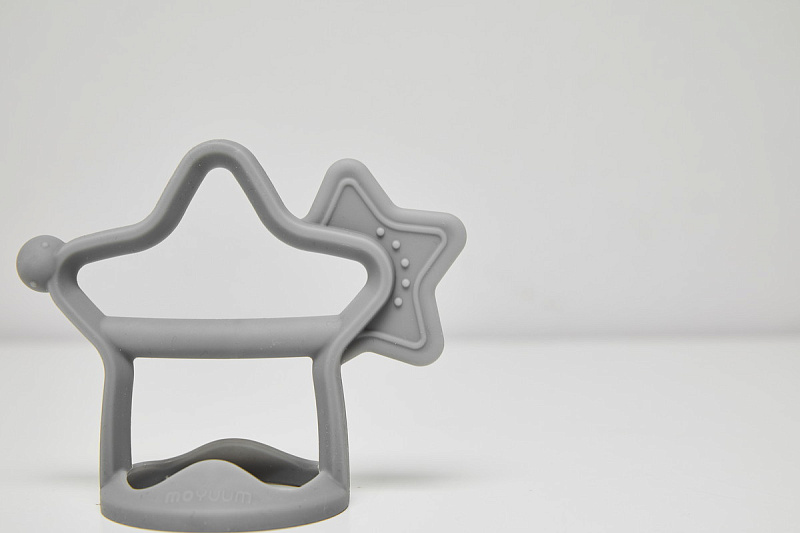 Moyuum – незаменимый помощник в период прорезывания зубов у младенцев. Прорезыватель эффективно устраняет неприятные болезненные ощущения, зуд и дискомфорт. Его выступающие части отлично подходят для мягкого массажа десен. В результате ребенок не сосет пальцы и обучается правильной привычке гигиены полости рта. В то же время милая привлекательная игрушка помогает отвлечь внимание и успокоить малыша, а ее спокойные красивые цвета приятны глазу. Мы разработали прорезыватель специальной эргономичной формы, без каких-либо съемных деталей, что обеспечивает детям полную безопасность. Аксессуар удобно фиксируется на руке и не выпадает из ладошки. Его небольшие размеры и легкий вес оптимальны для маленькой детской кисти. Особый дизайн позволяет чесалке стоять на столе. Жевательная поверхность при этом ни с чем не соприкасается и дольше остается чистой. Изделие изготовлено из премиального платинового силикона, отличающегося стабильностью при разных температурах от -50 до 200°С, поэтому его можно охлаждать и подмораживать. Этот качественный, абсолютно безопасный материал не имеет постороннего запаха и привкуса. Наш силиконовый прорезатель не деформируется, от него невозможно откусить кусочек, его легко мыть и стерилизовать любым способом. Выдерживает обработку в пмм и свч, стерилизацию паром и кипячением. Грызунок – идеальный подарок для новорожденных!