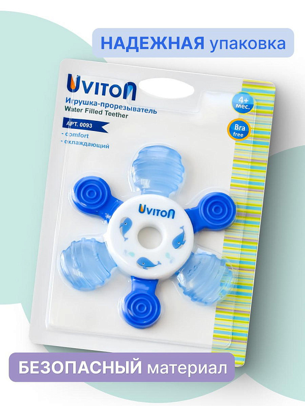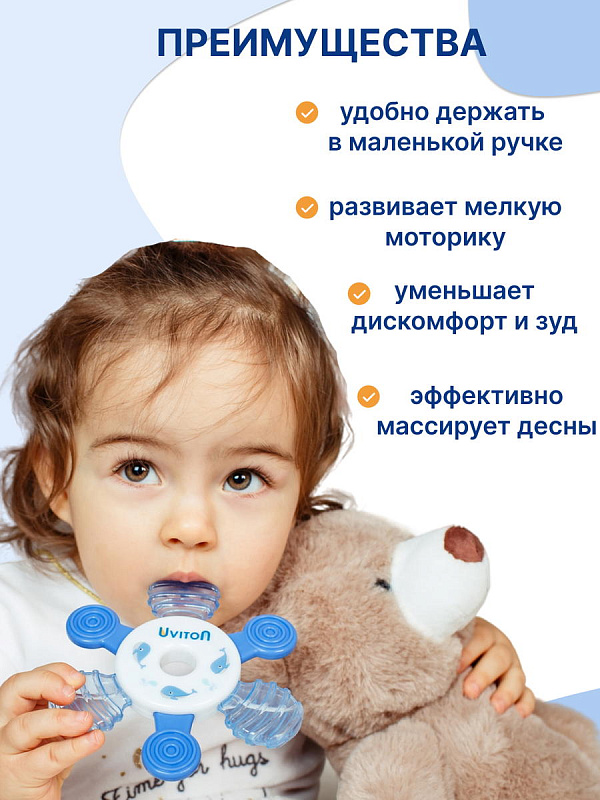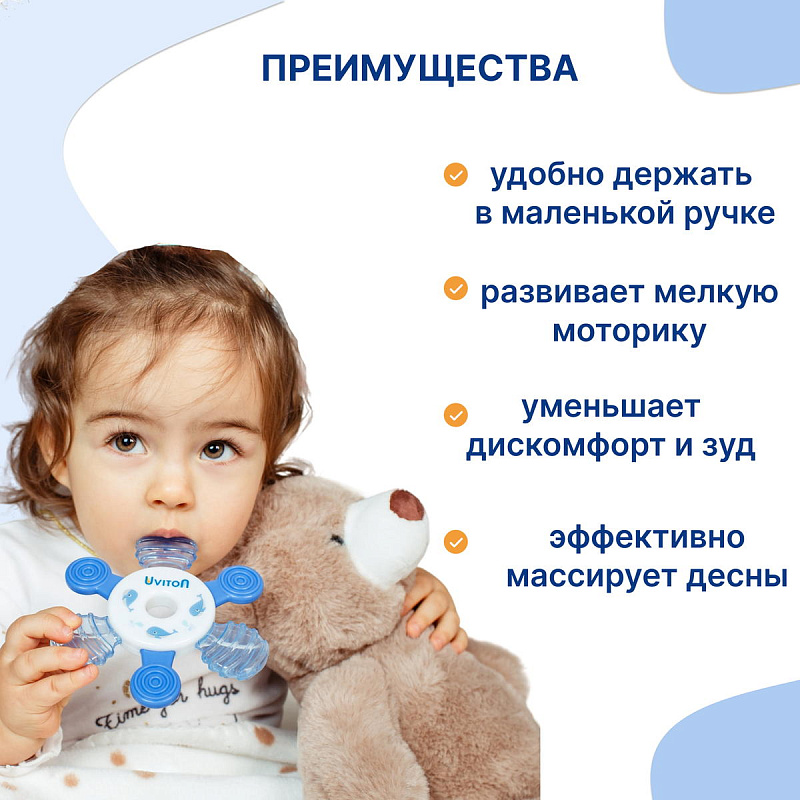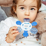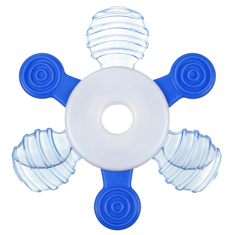 Силиконовые вставки внутри заполнены дистиллированной водой, которая обеспечивает анестезирующий эффект, если предварительно охладить прорезыватель в холодильнике (не более чем на час);