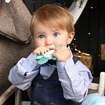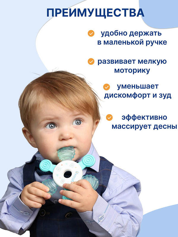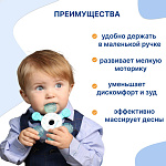 Способствует развитию у малыша хватательного рефлекса и мелкой моторики. С его помощью малыш будет учиться держать и перекладывать прорезыватель из одной ладони в другую.