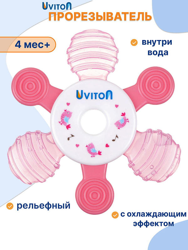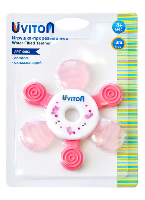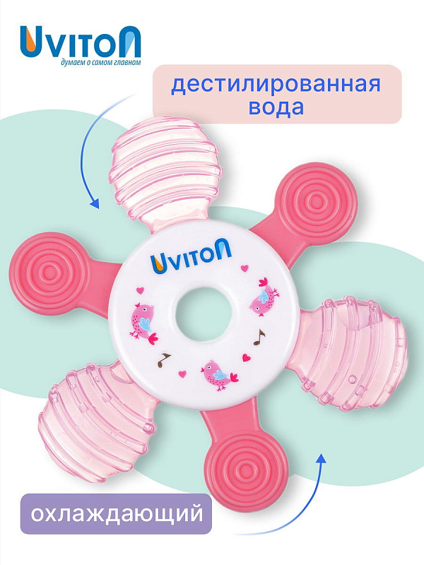Силиконовые вставки внутри заполнены дистиллированной водой, которая обеспечивает анестезирующий эффект, если предварительно охладить прорезыватель в холодильнике (не более чем на час);