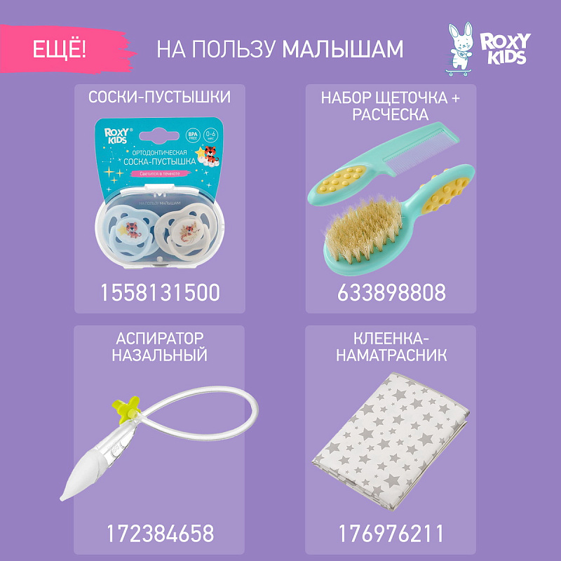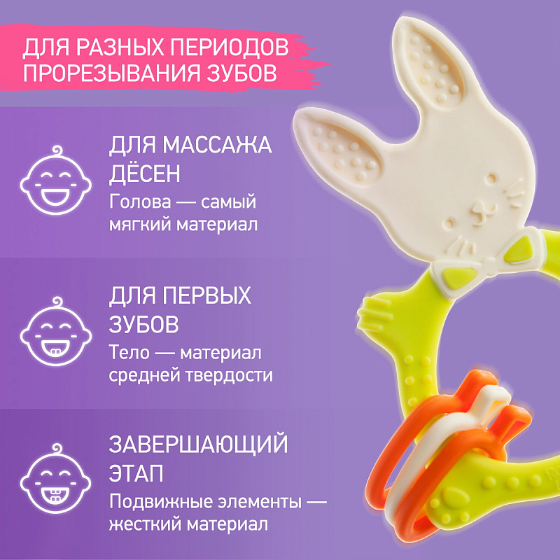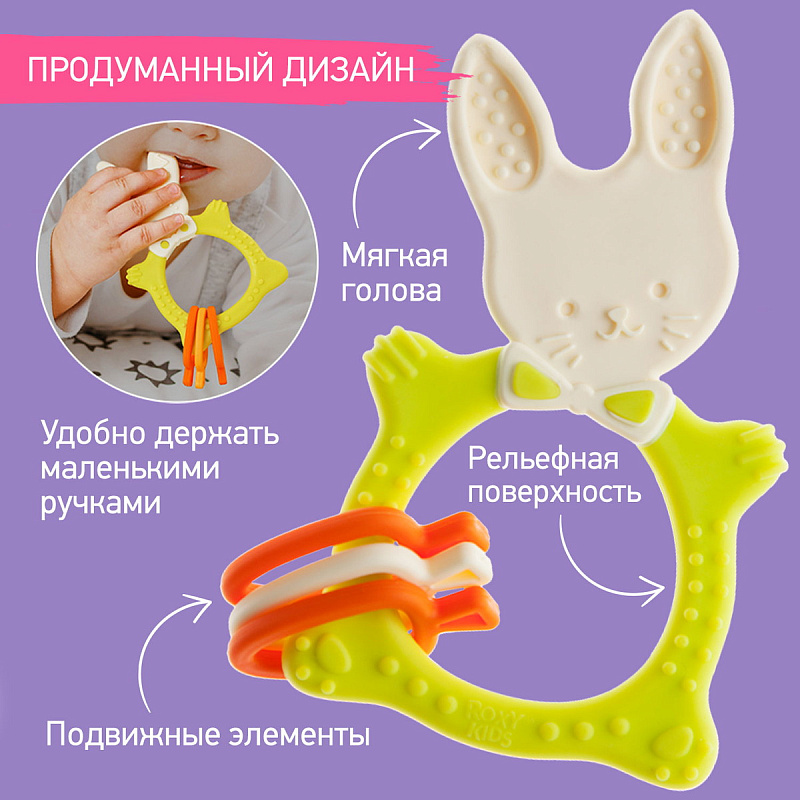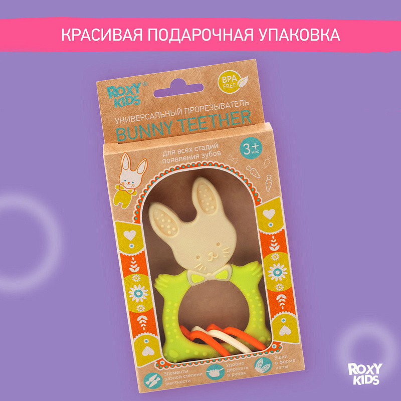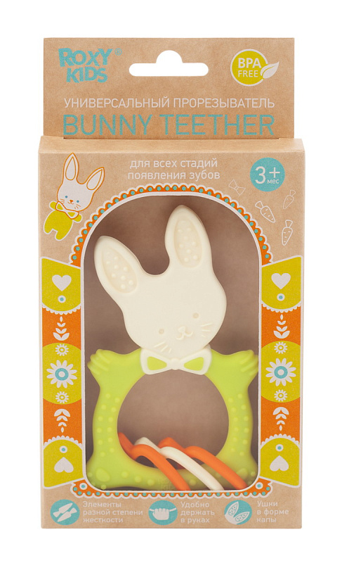 Прорезыватель для зубов BUNNY TEETHER от ROXY-KIDS подходит для всех стадий прорезывания зубов у малышей. Он состоит из элементов различной степени жесткости, что позволяет малышу использовать на протяжении всего времени прорезывания. На начальном этапе, когда у малыша раздражены десны, он может чесать их о мягкую рельефную голову зайчика. На завершающем этапе малыш сможет грызть более твердое тело и твердые морковки для лучшего эффекта. BUNNY TEETHER пригодится даже при прорезывания жевательных зубов, потому что ушки зайца по форме похожи на капу, что позволит малышу снять зуд с самых дальних десен. Прорезыватель сделан из безопасных гипоаллергенных материалов (термоэластопласта и полипропилена), так что ребенок может грызть его целыми днями. Еще одна отличительная особенность BUNNY TEETHER это тело, сделанное в форме кольца, которое малыш сможет удобно держать. В ассортименте ROXY-KIDS прорезыватели BUNNY TEETHER представлены в нескольких цветах. Соответствует стандартам безопасности товаров для детей.