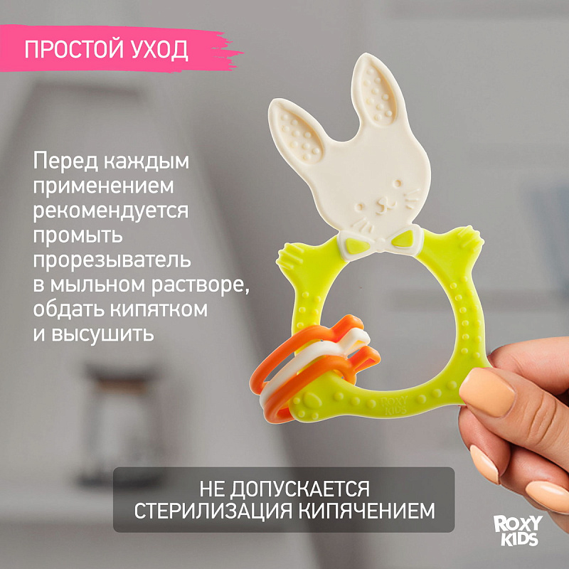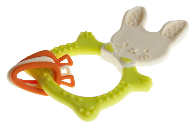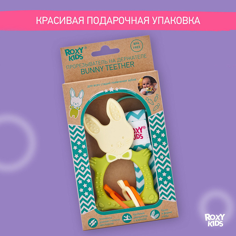 Прорезыватель для зубов BUNNY TEETHER от ROXY-KIDS подходит для всех стадий прорезывания зубов благодаря элементам различной степени жесткости. На начальном этапе, когда у малыша раздражены десны, он может чесать их о мягкую рельефную голову зайчика. На завершающем этапе малыш сможет грызть более твердое тело и твердые морковки. BUNNY TEETHER пригодится даже при прорезывания жевательных зубов, потому что ушки зайца по форме похожи на капу, что позволит малышу снять зуд с самых дальних десен. Прорезыватель сделан из безопасных гипоаллергенных материалов термоэластопласта и полипропилена. Тело BUNNY TEETHER сделано в форме кольца, которое малыш сможет удобно держать. Специальный держатель избавит ребенка от риска потерять или испачкать прорезыватель. Один конец держателя прикрепляется к прорезывателю, а второй при помощи специальной клипсы пристегивается к одежде ребенка. Держатель выполнен из двух слоев полиэстера, прочно сшитых вместе, поэтому он не износится и не порвется.