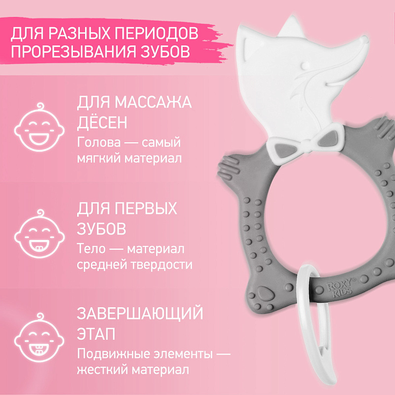 Прорезыватель для зубов FOX TEETHER от ROXY-KIDS подходит для всех стадий прорезывания зубов у малышей. Он состоит из элементов различной степени жесткости, что позволяет малышу использовать на протяжении всего времени прорезывания. На начальном этапе, когда у малыша раздражены десны, он может чесать их о мягкую рельефную голову лисенка. На завершающем этапе малыш сможет грызть более твердое тело и твердый хвост для лучшего эффекта. Прорезыватель сделан из безопасных гипоаллергенных материалов (термоэластопласта и полипропилена), так что ребенок может грызть его целыми днями. Еще одна отличительная особенность FOX TEETHER это тело, сделанное в форме кольца, которое малыш сможет удобно держать. В ассортименте ROXY-KIDS прорезыватели FOX TEETHER представлены в нескольких цветах. Соответствует стандартам безопасности товаров для детей.