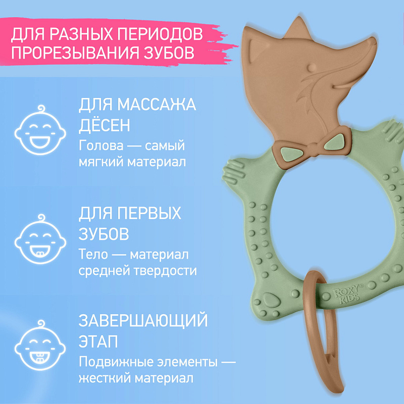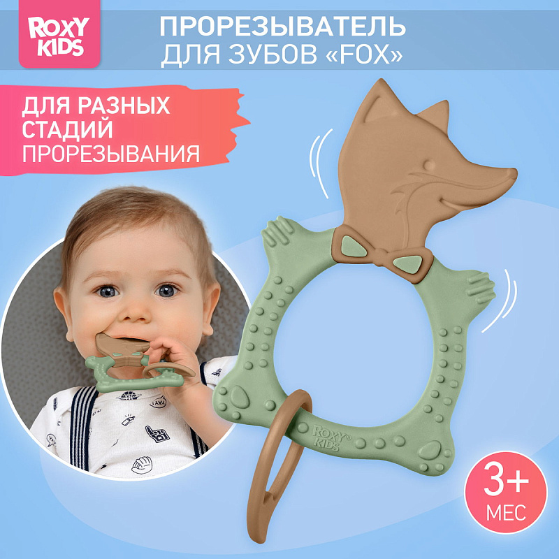 Прорезыватель для зубов FOX TEETHER от ROXY-KIDS подходит для всех стадий прорезывания зубов у малышей. Он состоит из элементов различной степени жесткости, что позволяет малышу использовать на протяжении всего времени прорезывания. На начальном этапе, когда у малыша раздражены десны, он может чесать их о мягкую рельефную голову лисенка. На завершающем этапе малыш сможет грызть более твердое тело и твердый хвост для лучшего эффекта. Прорезыватель сделан из безопасных гипоаллергенных материалов (термоэластопласта и полипропилена), так что ребенок может грызть его целыми днями. Еще одна отличительная особенность FOX TEETHER это тело, сделанное в форме кольца, которое малыш сможет удобно держать. В ассортименте ROXY-KIDS прорезыватели FOX TEETHER представлены в нескольких цветах. Соответствует стандартам безопасности товаров для детей.