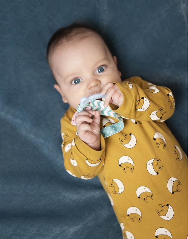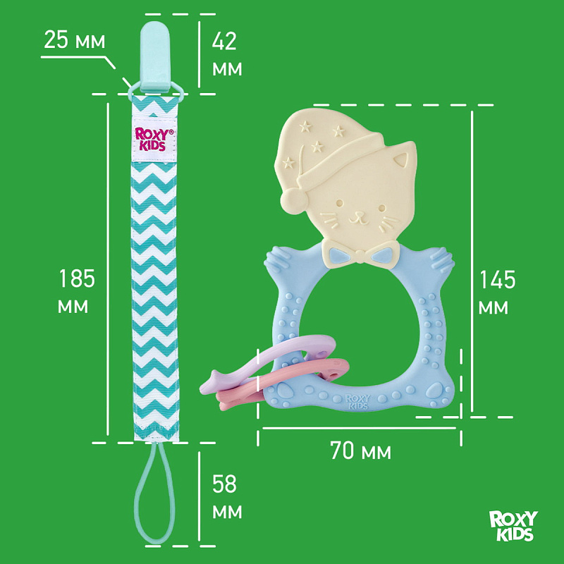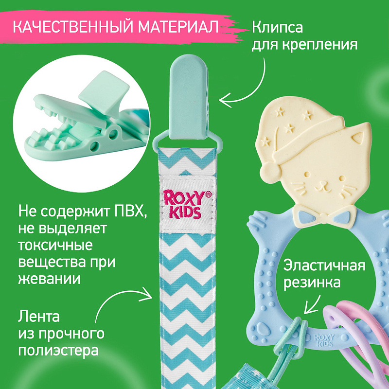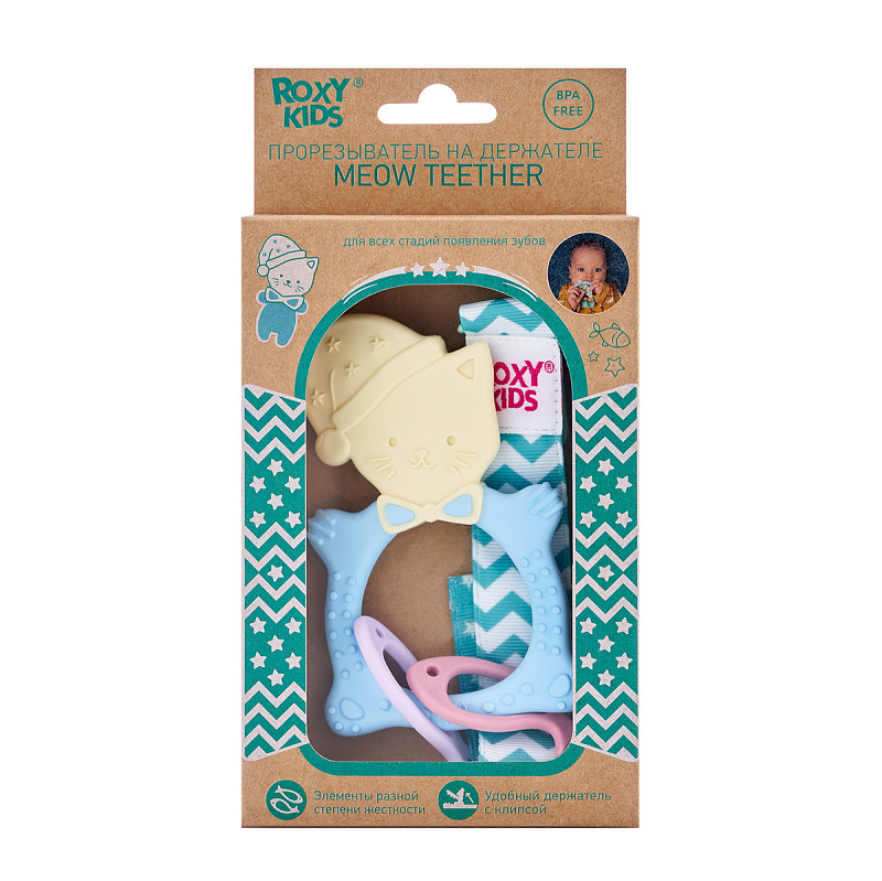 Прорезыватель для зубов MEOW TEETHER от ROXY-KIDS подходит для всех стадий прорезывания зубов у малышей. Он состоит из элементов различной степени жесткости, что позволяет его использовать на протяжении всего времени прорезывания. На начальном этапе, когда у малыша раздражены десны, он может чесать их о мягкую рельефную голову котенка. На завершающем этапе малыш сможет грызть более твердое тело и жесткие элементы в виде рыбок. Прорезыватель сделан из безопасных гипоаллергенных материалов (термоэластопласта и полипропилена), так что ребенок может грызть его целыми днями. Еще одна особенность MEOW TEETHER – это тело, сделанное в форме кольца, которое малыш сможет удобно держать. Специальный держатель избавит ребенка от риска потерять или испачкать прорезыватель. Один конец держателя прикрепляется к прорезывателю, а второй при помощи специальной клипсы пристегивается к одежде ребенка. Держатель выполнен из двух слоев полиэстера, прочно сшитых вместе, поэтому он не износится и не порвется.