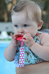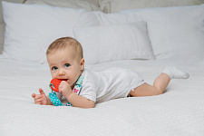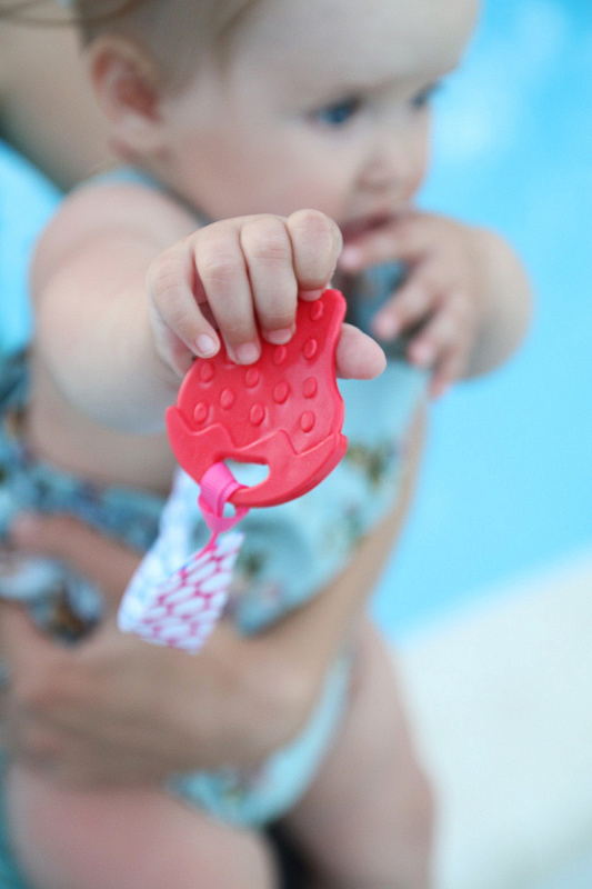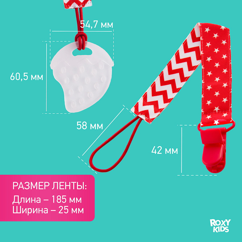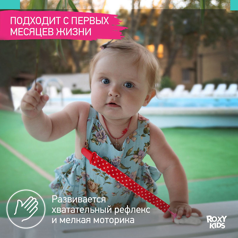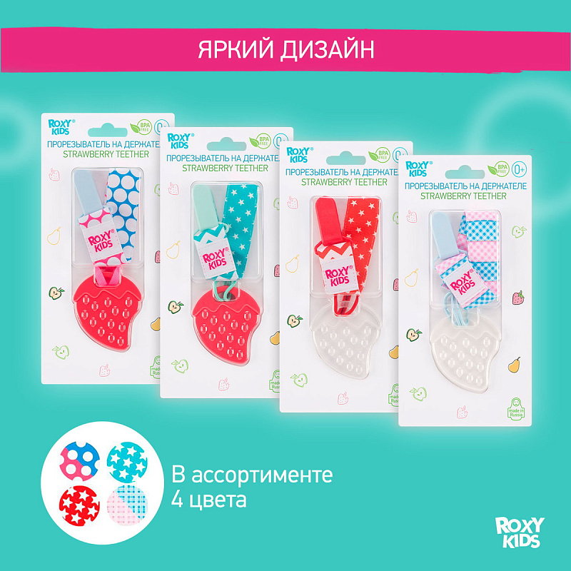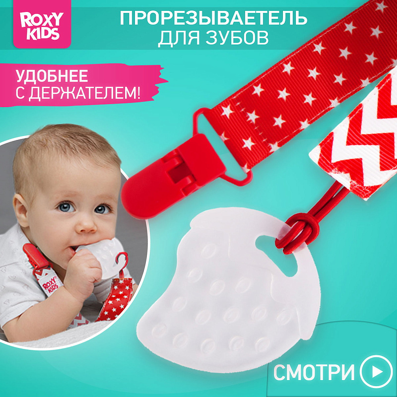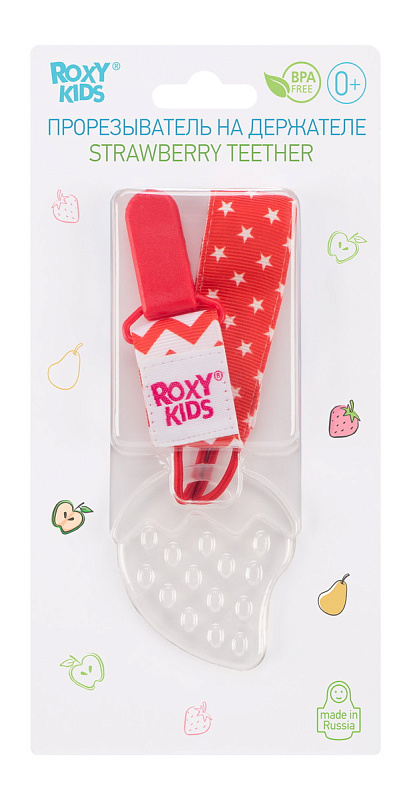 Прорезыватель для зубов на держателе ROXY-KIDS в форме клубнички подойдет маленьким непоседам. Если ваш малыш все время роняет грызунок, то держатель поможет избегать эту проблему. Прорезыватель-клубничка надежно крепится к одежде ребенка при помощи яркого держателя, а сама мягкая клубничка имеет рельефную поверхность, которая хорошо массирует десны малыша. Кроме того, грызунок можно охладить для дополнительного болеутоляющего эффекта. Материалы держателя и клубнички безопасны и соответствуют стандартам безопасности. Лента выполнена из прочного полиэстера и прослужит вам очень долго. Держатель легко отсоединить от прорезывателя и использовать его также с ниблером, соской или пустышкой. В ассортименте ROXY-KIDS представлены прорезыватели в различных цветах.