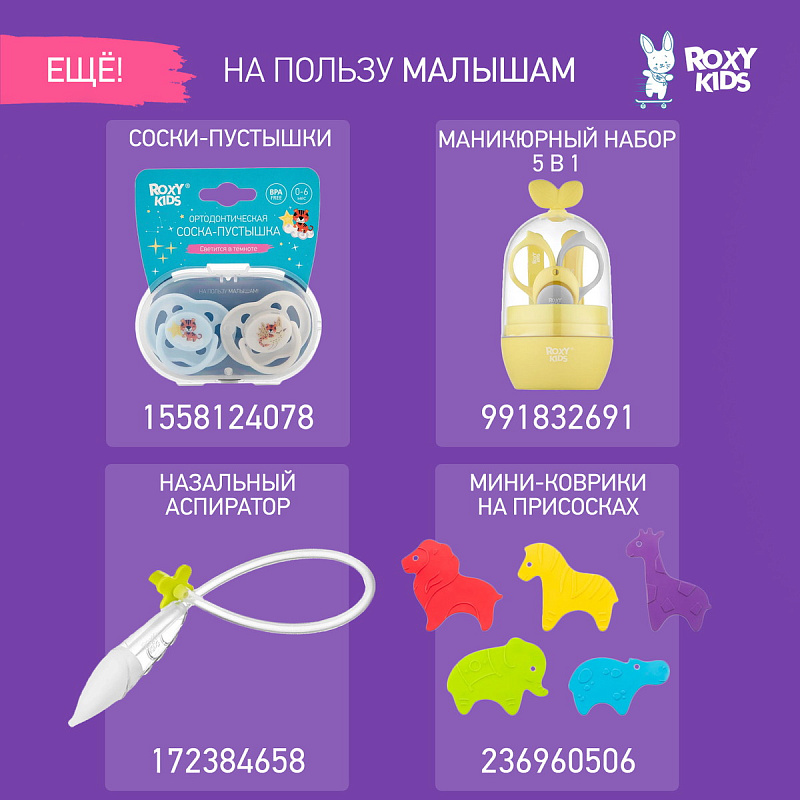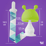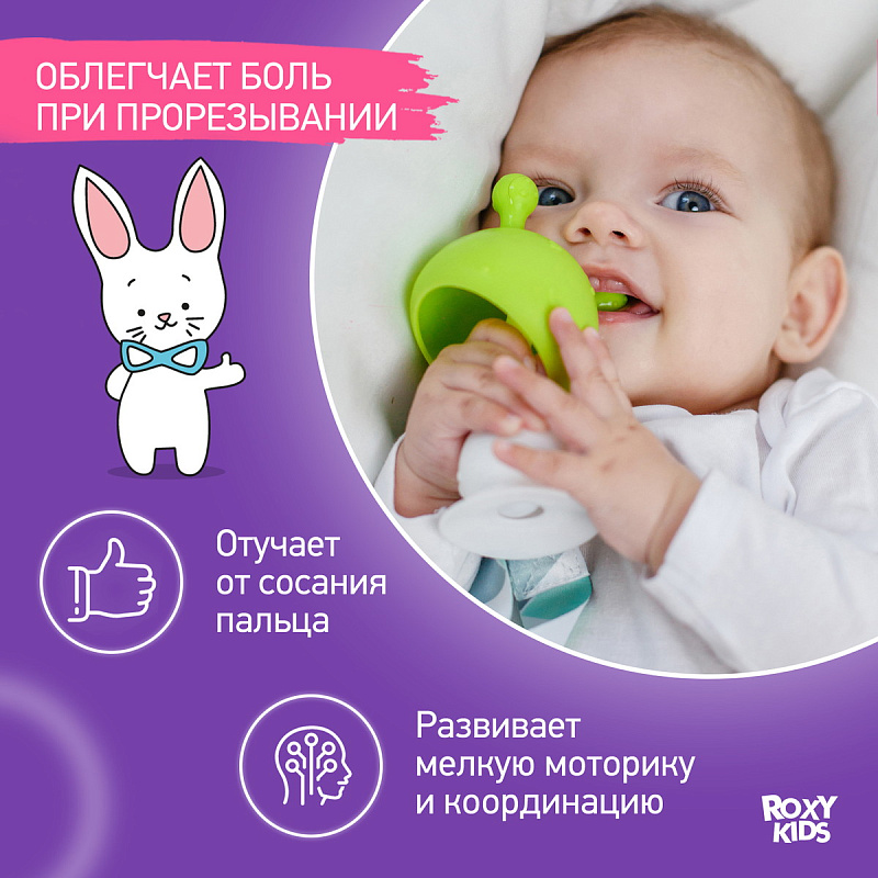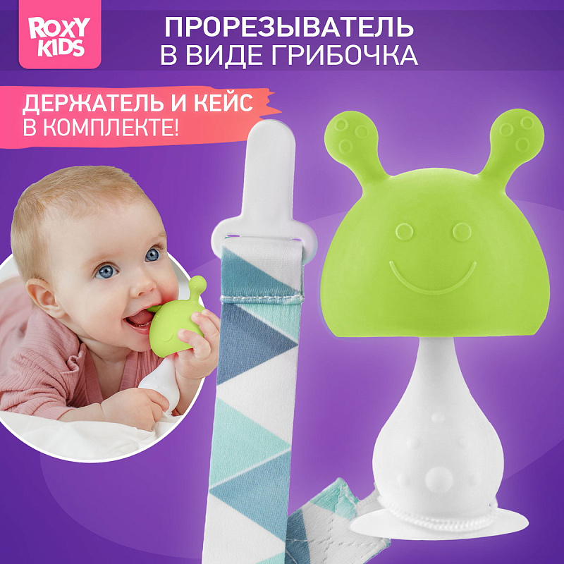 Прорезыватель для зубов MUSHROOM от ROXY-KIDS в форме грибочка безопасно массирует десны двумя ушками разной степени жесткости и снимает неприятные ощущения во время прорезывания зубов. Элементы в форме соска напоминают малышу мамину грудь. Кулачок малыша полностью помещается внутри полусферы грибочка. Ребенок крепко держит прорезыватель в кулачке и отучается от сосания пальца. Благодаря анатомической форме прорезыватель подходит для новорожденных и может выполнять функцию соски. Использование прорезывателя успокаивает малыша, развивает координацию и моторику рук, мелодичная погремушка внутри привлекает внимание и развлекает ребенка. С помощью присоски прорезыватель можно установить на столик или детский стульчик. В комплект входит держатель с надежной запатентованной клипсой, поэтому прорезыватель не упадет и не потеряется. Один конец держателя прикрепляется к прорезывателю, а второй при помощи специальной клипсы пристегивается к одежде ребенка. Держатель выполнен из двух слоев полиэстера, прочно сшитых вместе, поэтому он не износится и не порвется.