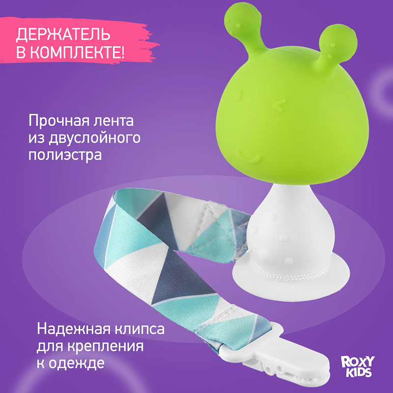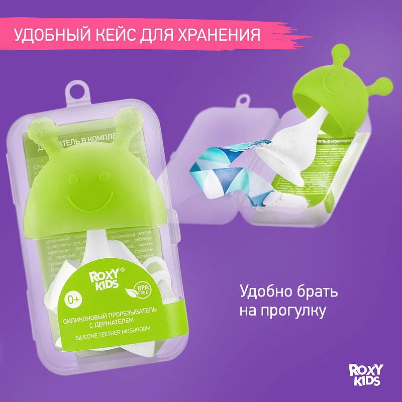 Прорезыватель силиконовый Roxy-Kids Грибочек с держателем в футляре RST-001-G салатовый6 оценокХарактеристики