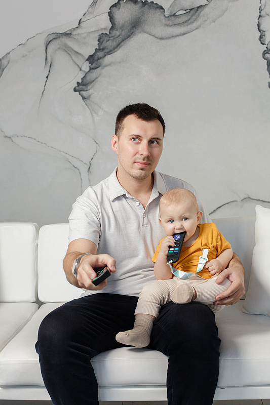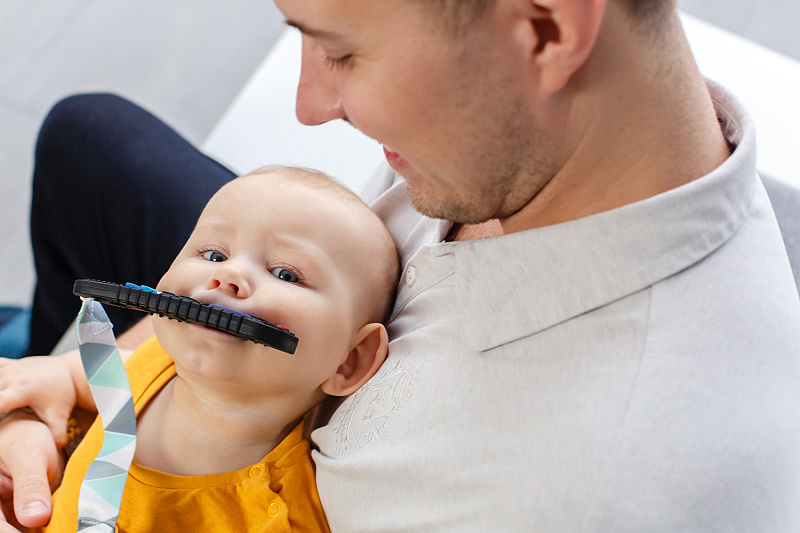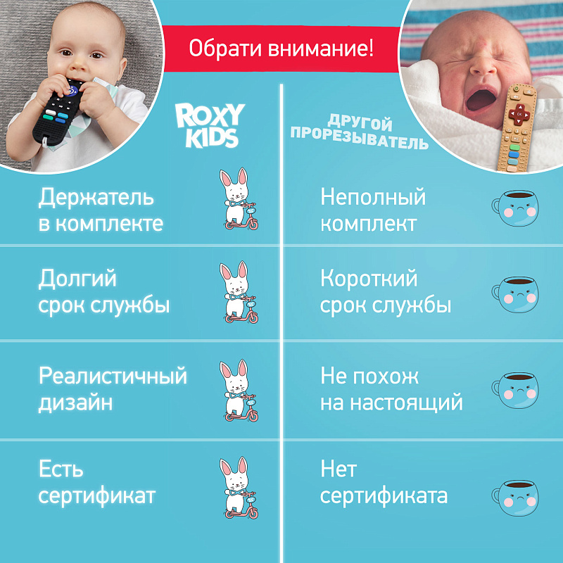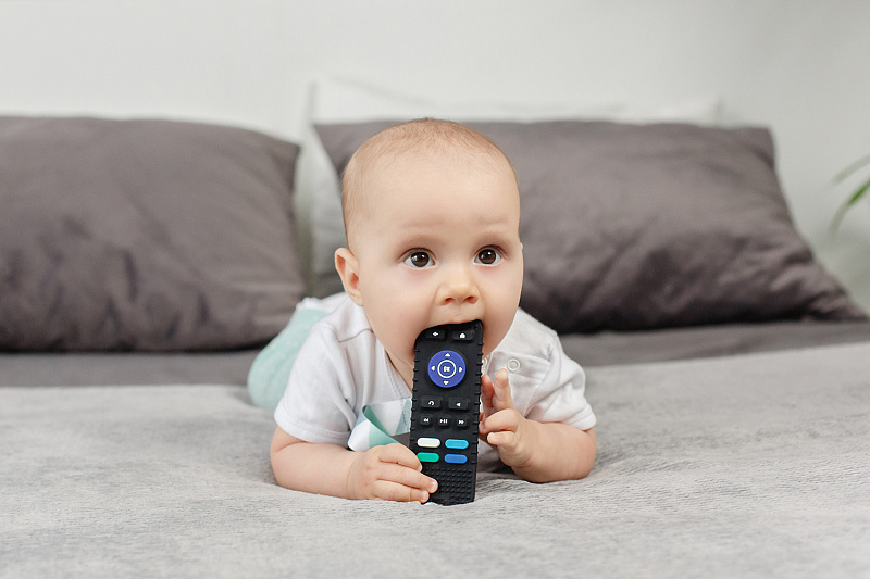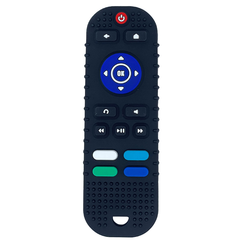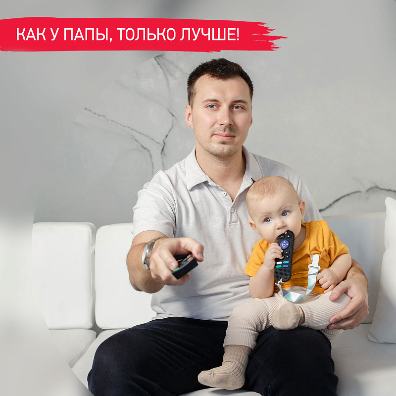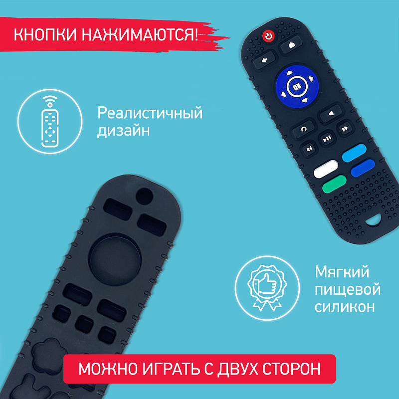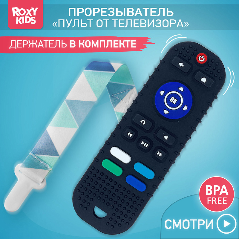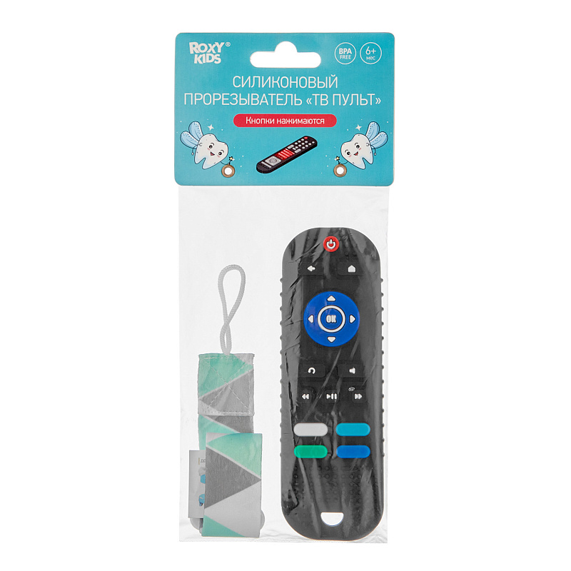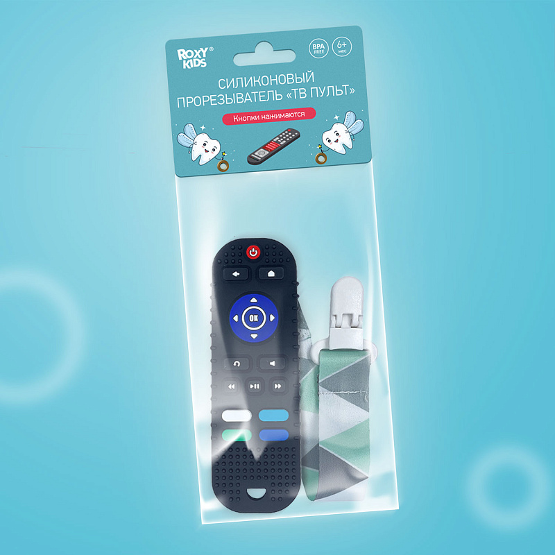 Реалистичный прорезыватель в виде ТВ-пульта от ROXY-KIDS – яркая и интересная игрушка, которая порадует вашего малыша и поможет снизить дискомфорт во время прорезывания зубов! Силиконовый ТВ-пульт выглядит как настоящий и надолго увлечет малыша благодаря интерактивным кнопкам, которые можно нажимать. Рельефная поверхность эффективно массирует десны и зубки малыша, облегчая боль и зуд при появлении первых зубов. Использование прорезывателя поможет развить моторику рук, координацию движений, а также восприятие цвета и формы. Для еще большего удобства прорезыватель оснащен специальным отверстием для держателя и формой для приготовления льда с обратной стороны. Аксессуар изготовлен из гипоаллергенного пищевого силикона и подходит для ежедневного использования. В комплект входит держатель с надежной запатентованной клипсой, поэтому прорезыватель не упадет и не потеряется. Один конец держателя прикрепляется к прорезывателю, а второй при помощи специальной клипсы пристегивается к одежде ребенка. Держатель выполнен из двух слоев полиэстера, прочно сшитых вместе, поэтому он не износится и не порвется.