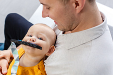 Материал изготовленияпрорезыватель – пищевой силикон, держатель – полиэстер, АБС-пластик