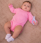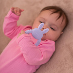 Прорезыватель выполнен в виде забавного кролика с мягкими ушками-щеточками. Ручка изготовлена в виде кольца с рельефной поверхностью. Рельеф обеспечивает сенсорную стимуляцию и помогает развивать мелкую моторику.