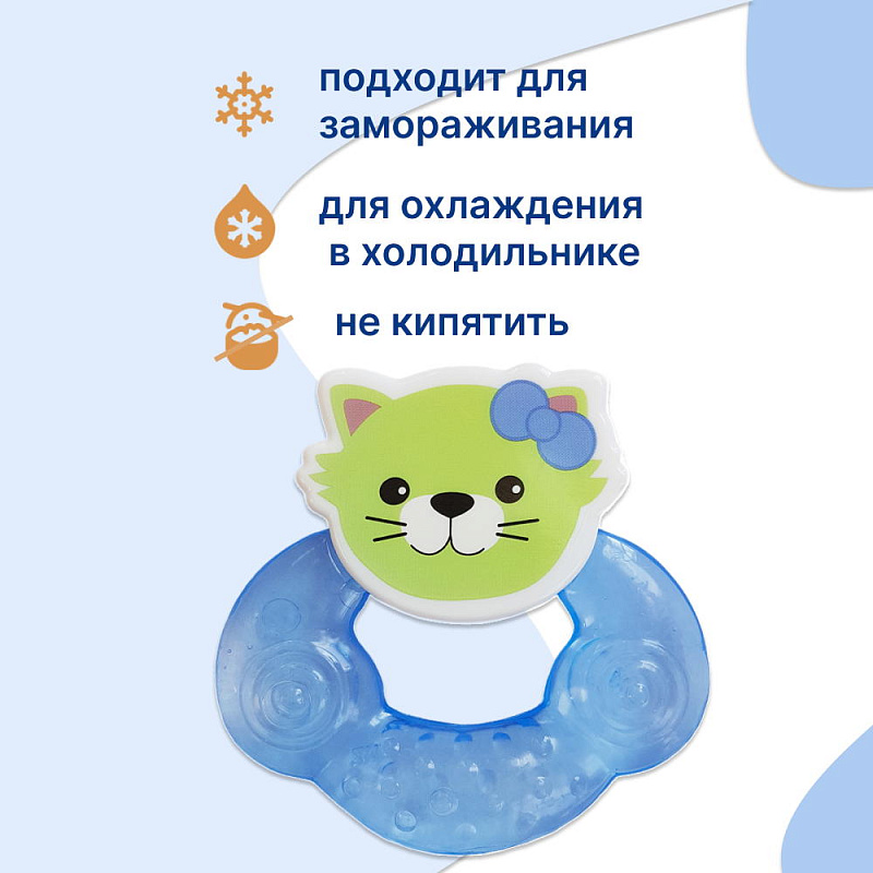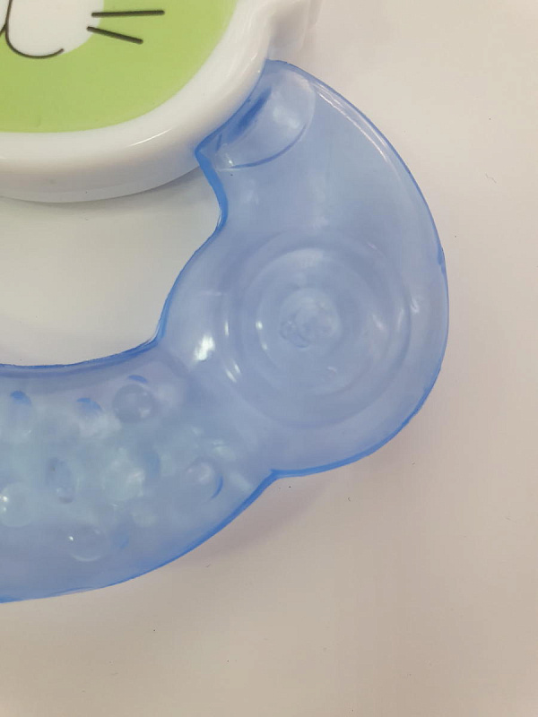 Прорезыватель заполнен дистиллированной водой, которая обеспечивает анестезирующий эффект, если предварительно охладить прорезыватель в холодильнике (не более часа.)
