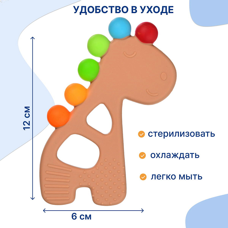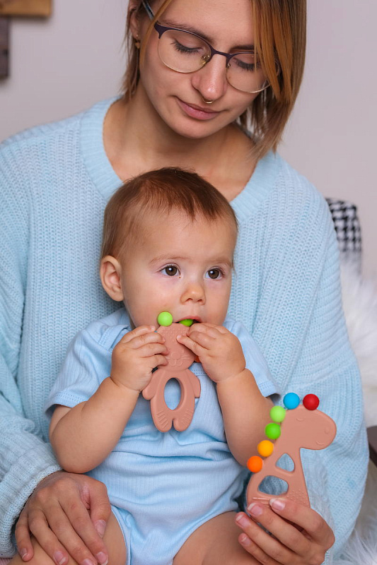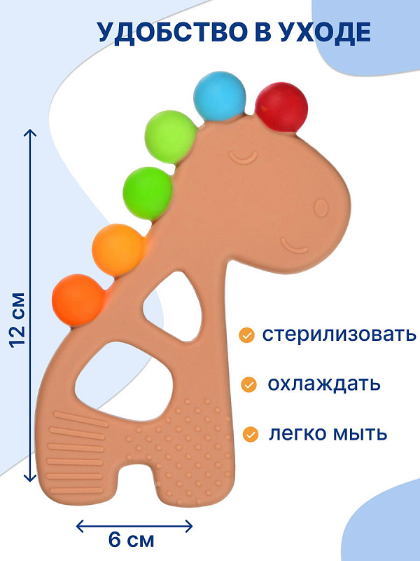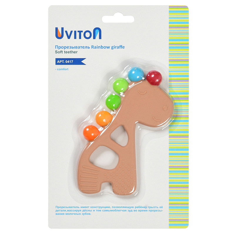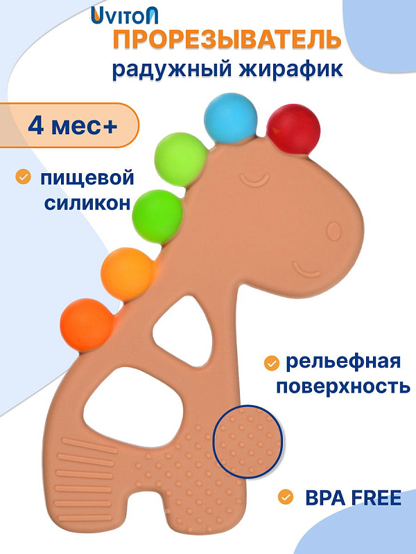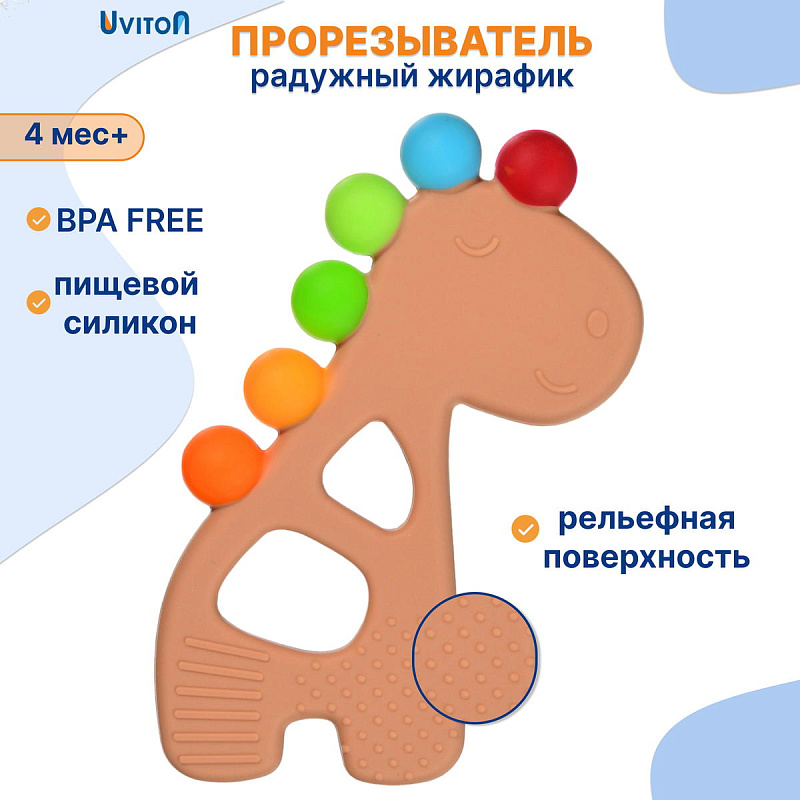 Прорезыватель Радужный жирафик от Uviton поможет малышу в период прорезывания первых зубов. С ним легче справится с неприятными ощущениями и дискомфортом. В эти моменты малыш может быть особенно капризным и раздражительным. Чтобы помочь ребенку пережить этот период и облегчить болезненное состояние, прорезыватель допускается использовать с зубным гелем. Прорезыватель мягкий из пищевого силикона, поможет унять зуд в воспаленных деснах не нанося им вреда. В период облегчения с жирафиком так интересно играть и изучать цвета, он будет дарить спокойствие малышу. Прорезыватель отлично подходит для самых маленьких малышей, у которых только начинаются резаться зубки.