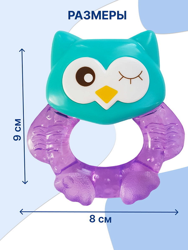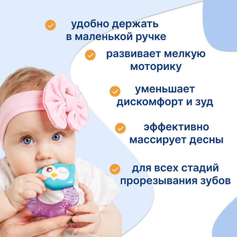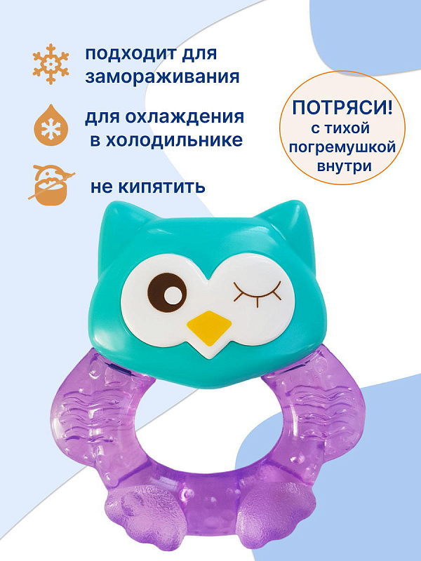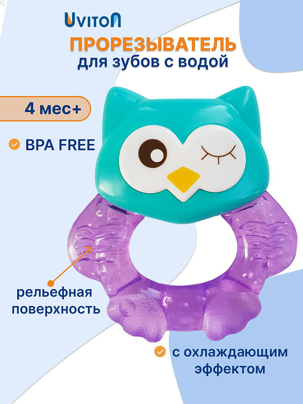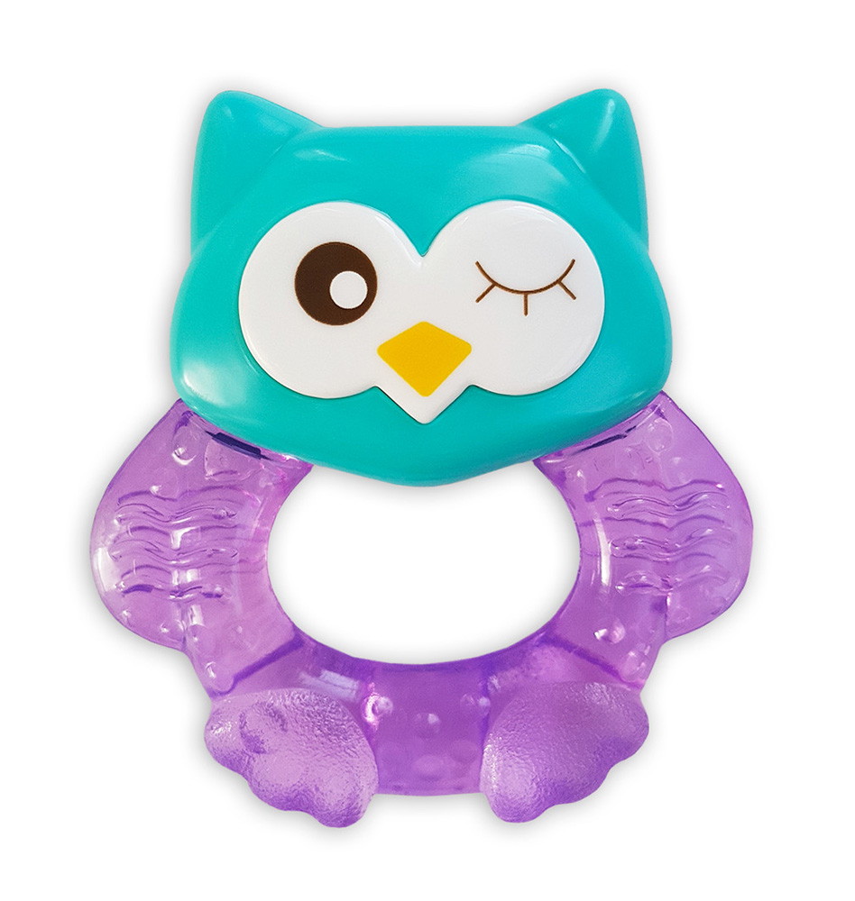 Прорезыватель Совенок Fill от Uviton совмещает в себе функцию прорезывателя и игрушки. Если его потрясти, то будет слышен не громкий звук погремушки. Изготовлен он так, чтобы маленьким ручкам было удобно его удерживать. Внутри прорезыватель заполнен дистиллированной водой, которая обеспечивает анестезирующий эффект, если предварительно охладить его в холодильнике (не более 1 часа). Яркий он обязательно привлечет внимание малыша.