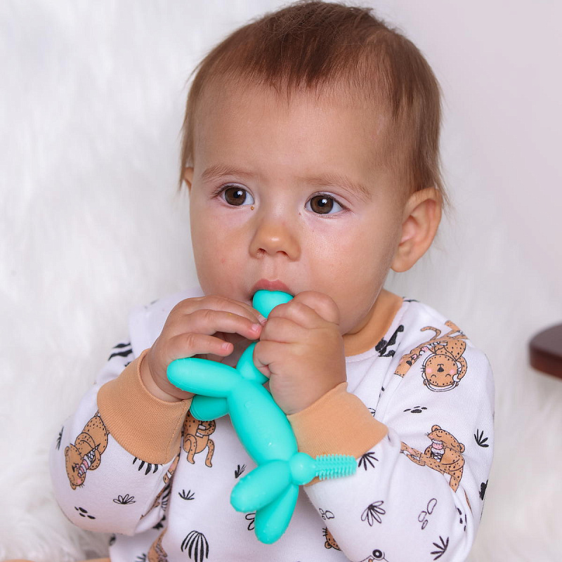 Форма прорезывателя напоминает лошадку, собранную из воздушных шариков. Игрушка тактильно приятная на ощупь. С ней так интересно играть!