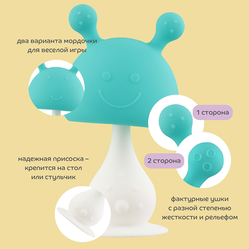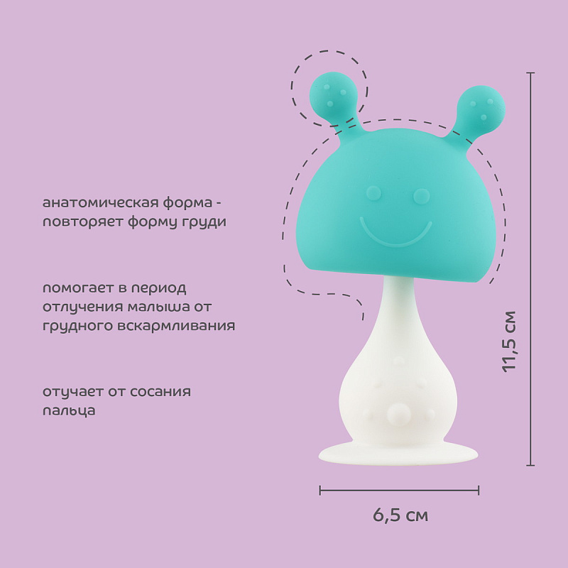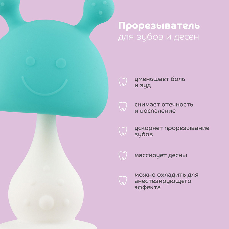 Прорезыватель поможет уменьшить неприятные ощущения во время прорезывания зубов. Форма прорезывателя разработана специально для передних зубов. Благодаря текстурированной поверхности создается массажный эффект, успокаивающий раздражение. Колпачок поможет сохранить гигиеничность изделия. Прорезыватель удобно брать с собой на прогулку или в дорогу.
