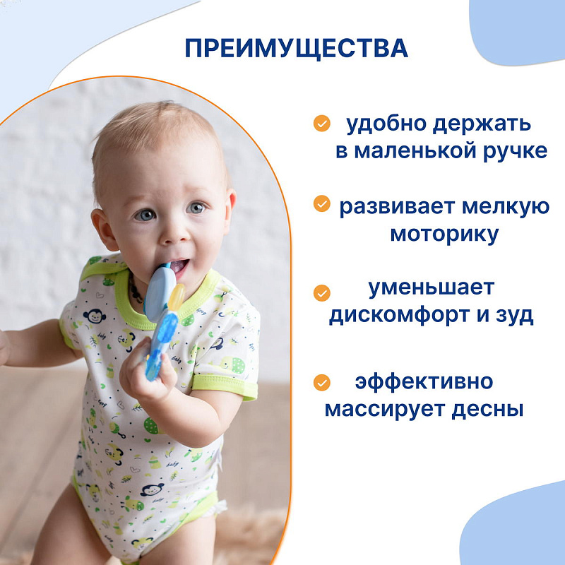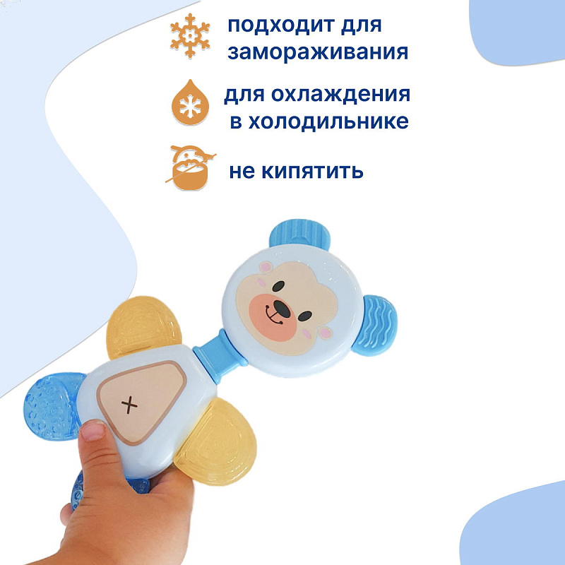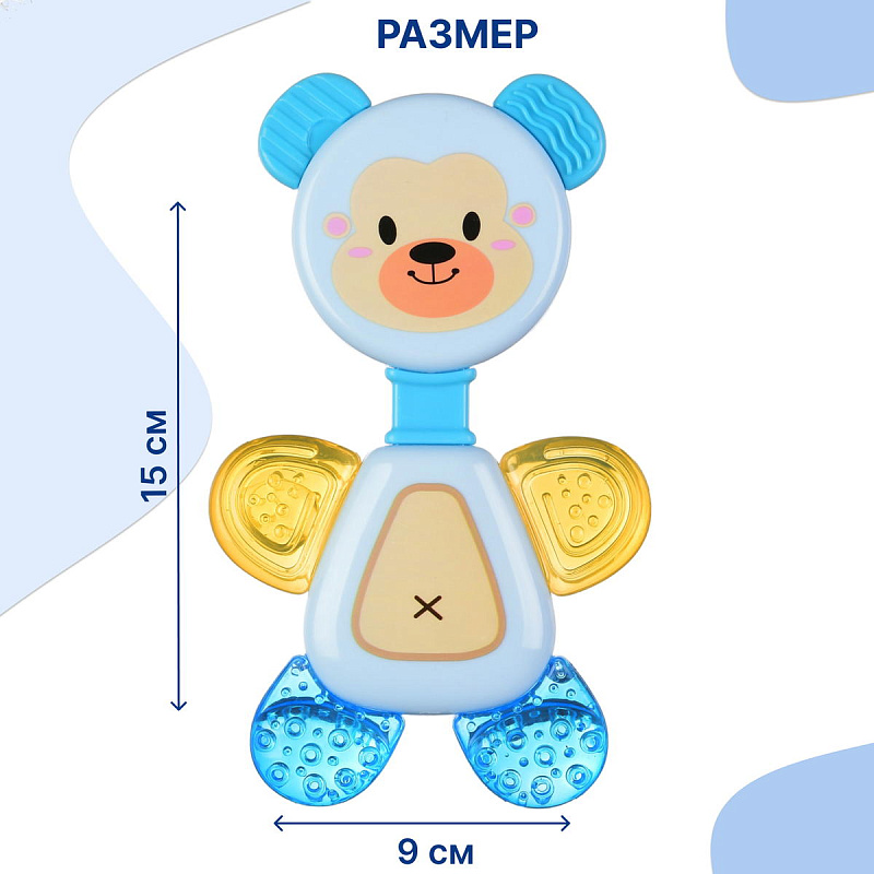 Веселые и яркие медвежата порадуют Вашего ребенка. Ушки и лапки медвежонка выполнены из мягкого материала и имеют рельефную поверхность, позволяющую грызть их и тем самым массировать раздраженные десны облегчая зуд при прорезывании зубов. Безвредный материал и округлая форма без острых краев гарантирует безопасность для малыша.