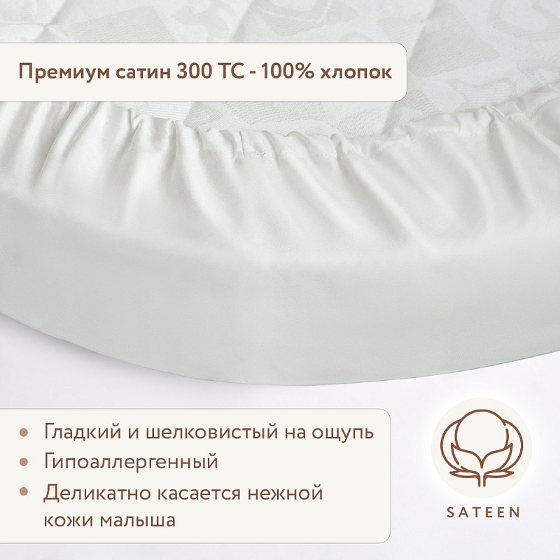 Сатиновая простыня на резинке — красивое и практичное дополнение к вашему постельному комплекту. Натуральный хлопок экологичен и безопасен для ребенка, простыня деликатно касается кожи малыша нежной шелковистой поверхностью.