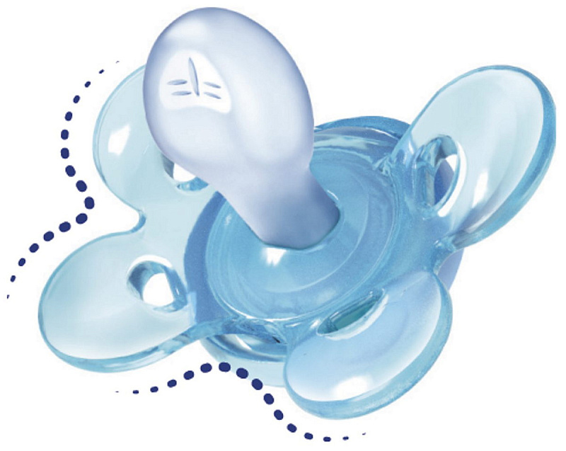 Конструкция пустышки соприкасается с лицом ребенка в 4-х точках, позволяя губам естественно двигаться во время сосания, а также оставляет свободное пространство в зоне носа и подбородка, облегчая дыхание. Ультратонкое основание соски пустышки обеспечивает естественное закрытие рта. Пустышку можно закрепить на клипсе через специальное кольцо.