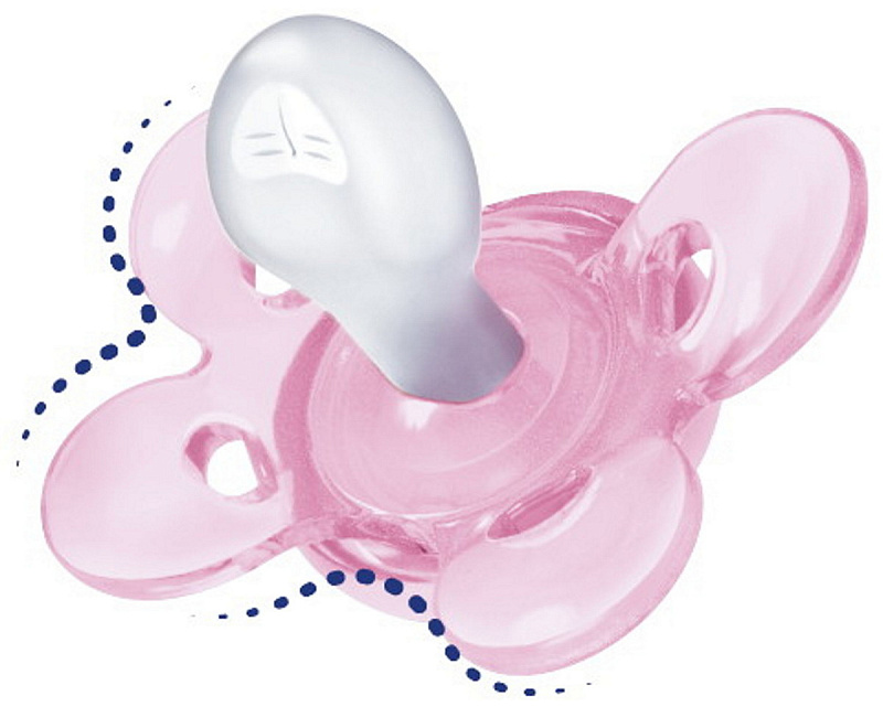 Конструкция пустышки соприкасается с лицом ребенка в 4-х точках, позволяя губам естественно двигаться во время сосания, а также оставляет свободное пространство в зоне носа и подбородка, облегчая дыхание. Ультратонкое основание соски пустышки обеспечивает естественное закрытие рта. Пустышку можно закрепить на клипсе через специальное кольцо.