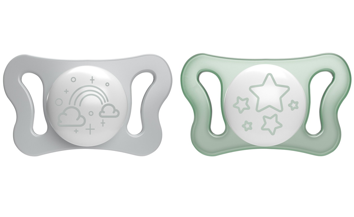Благодаря большим вентиляционным отверстиям кожа дышит и не потеет, эргономичная форма повторяет контуры лица и оставляет достаточно места для носика и подбородка малыша, силиконовая часть практична в уходе и не деформируется во время использования. Комплектность: 2 штуки в упаковке, футляр для пустышки. Рекомендации по уходу: пустышку и футляр стерилизовать в стерилизаторе. Рекомендации по замене пустышки: 1 раз в 1-2 месяца.