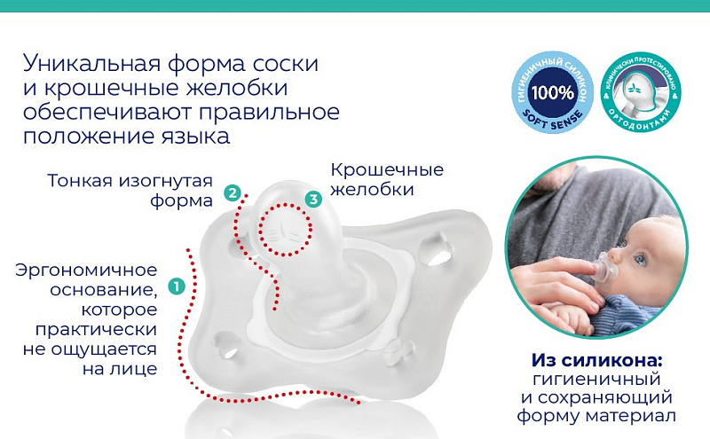 Доказанные исследования показывают, что соски Chicco PhysioForma® тренируют все жизненно важные функции рта для здорового роста: дыхание, сосание, глотание, жевание и фонетическую деятельность.