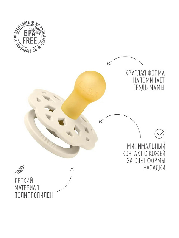 Пустышки BIBSизготавливаются из экологичных, на 100% безопасных материалов. Сосок у пустышки сделан из натурального каучука (латекса), а защитная накладка (шилдик) – из полипропилена.