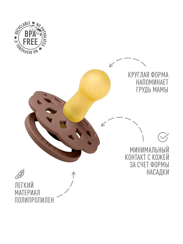 Пустышки BIBSизготавливаются из экологичных, на 100% безопасных материалов. Сосок у пустышки сделан из натурального каучука (латекса), а защитная накладка (шилдик) – из полипропилена.