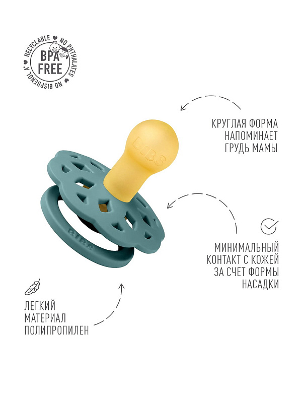 Пустышки BIBSизготавливаются из экологичных, на 100% безопасных материалов. Сосок у пустышки сделан из натурального каучука (латекса), а защитная накладка (шилдик) – из полипропилена.