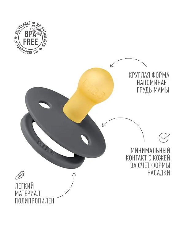 Пустышки BIBS изготавливаются из экологичных, на 100% безопасных материалов. Сосок у пустышки сделан из натурального каучука (латекса), а защитная накладка (шилдик) — из полипропилена. Изогнутая форма накладки минимизирует контакт с чувствительной и нежной кожей вокруг рта ребенка.