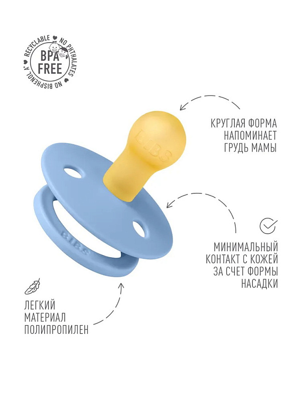 Пустышки BIBS изготавливаются из экологичных, на 100% безопасных материалов. Сосок у пустышки сделан из натурального каучука (латекса), а защитная накладка (шилдик) — из полипропилена. Изогнутая форма накладки минимизирует контакт с чувствительной и нежной кожей вокруг рта ребенка.