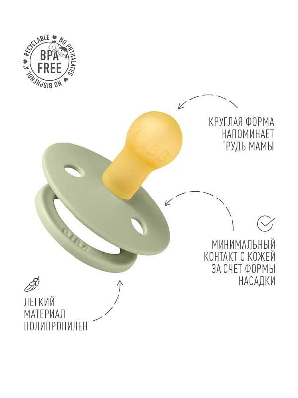 Пустышки BIBS изготавливаются из экологичных, на 100% безопасных материалов. Сосок у пустышки сделан из натурального каучука (латекса), а защитная накладка (шилдик) — из полипропилена. Изогнутая форма накладки минимизирует контакт с чувствительной и нежной кожей вокруг рта ребенка.